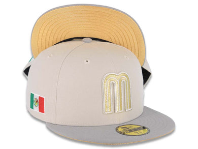 Mexico New Era 59FIFTY 5950 Fitted Cap Hat Stone Crown Gray Visor Metallic Gold/Metallic Silver Logo Mexico Flag Side Patch Metallic Gold