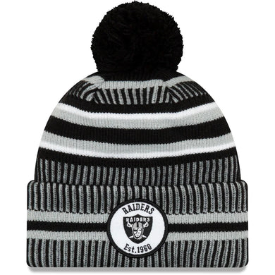 Oakland Raiders New Era NFL Cuffed Pom Knit Beanie Hat Black/Gray Crown/Visor Team Color Logo (2019 Sideline)