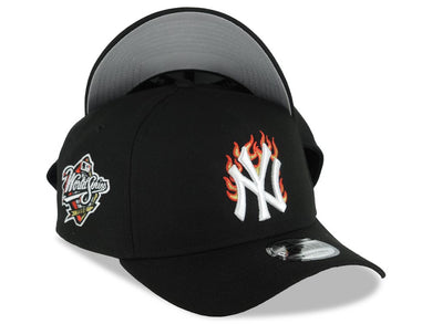 New York Yankees New Era MLB 9FORTY 940 Adjustable A-Frame Cap Hat Black Crown/Visor White/Metallic Gold/Red Flame Logo 1998 World Series Side Patch