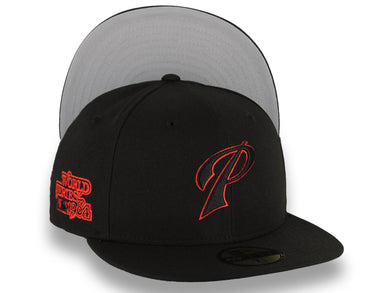San Diego Padres New Era MLB 59FIFTY 5950 Fitted Cap Hat Black Crown/Visor Black/Red "P" Script Logo 1984 World Series Side Patch Gray UV