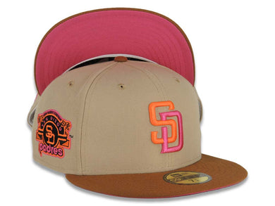 San Diego Padres New Era MLB 59FIFTY 5950 Fitted Cap Hat Khaki Crown Brown Visor Magenta/Orange Logo Stadium Side Patch Magenta UV