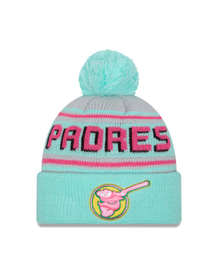 (City Connect) San Diego Padres New Era MLB Cuffed Pom Beanie/Knit Hat Light Teal/Pink Crown/Visor Pink/Yellow Swinging Friar Logo