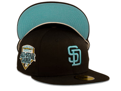 San Diego Padres New Era MLB 59Fifty 5950 Fitted Cap Hat Black Crown Sky Blue Logo 1992 All-Star Game Side Patch Sky Blue UV
