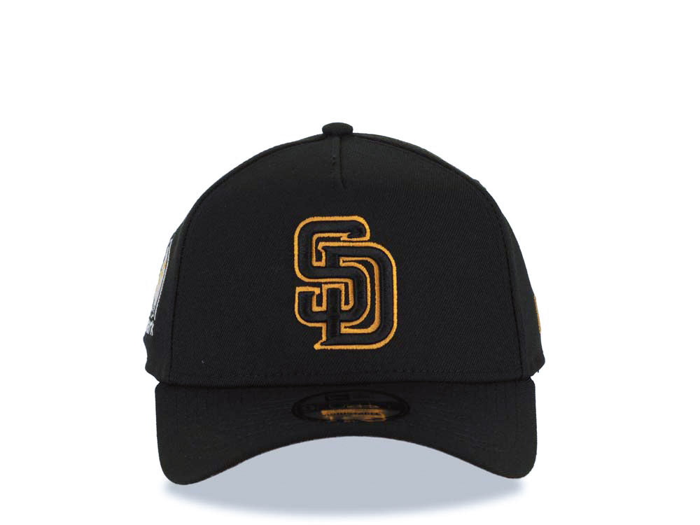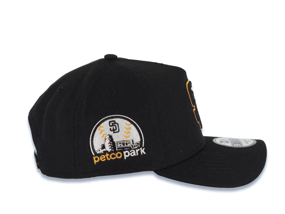 San Diego Padres New Era MLB 9FORTY 940 Adjustable A-Frame Cap Hat Black Crown/Visor Black/Tan Logo Petco Park Side Patch Tan UV