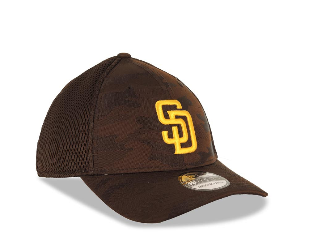 San Diego Padres New Era MLB 39THIRTY 3930 Flexfit Mesh Trucker Cap Hat Brown Camo Crown/Visor Yellow Logo