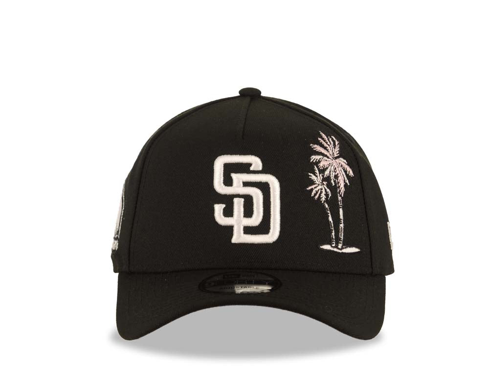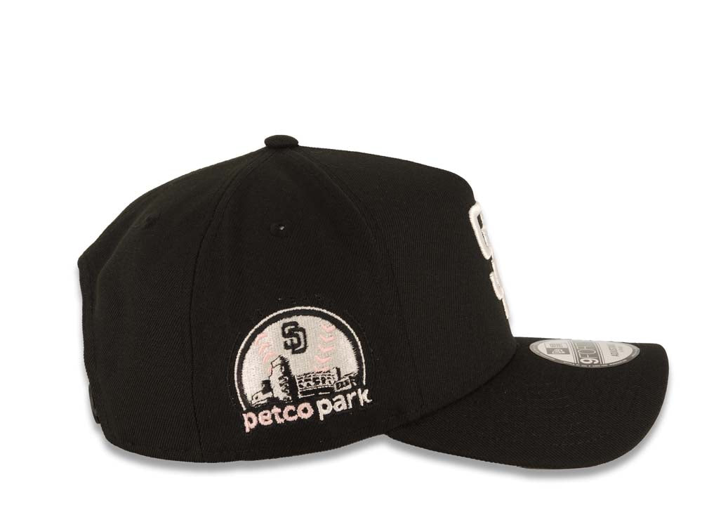 San Diego Padres New Era MLB 9FORTY 940 Adjustable A-Frame Cap Hat Black Crown/Visor White Logo With Pink Palm Petco Park Side Patch Gray UV