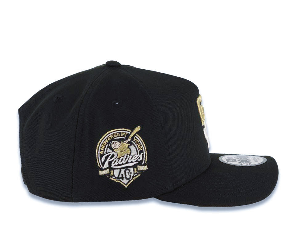 San Diego Padres New Era MLB 9FORTY 940 Adjustable A-Frame Cap Hat Black Crown/Visor White/Metallic Gold Drip Logo 40th Anniversary Side Patch