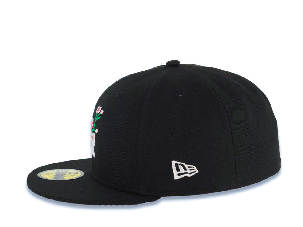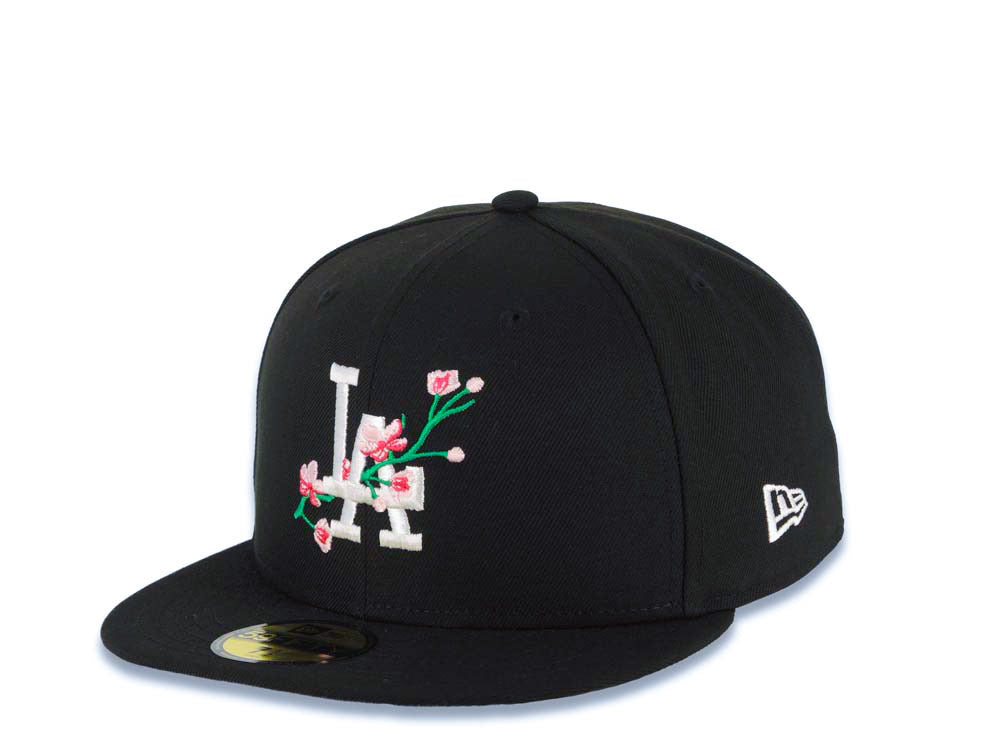 Los Angeles Dodgers New Era MLB 59FIFTY 5950 Fitted Cap Hat Black Crown/Visor White Logo With Flower Bloom Across Japan Flag Side Patch Gray UV