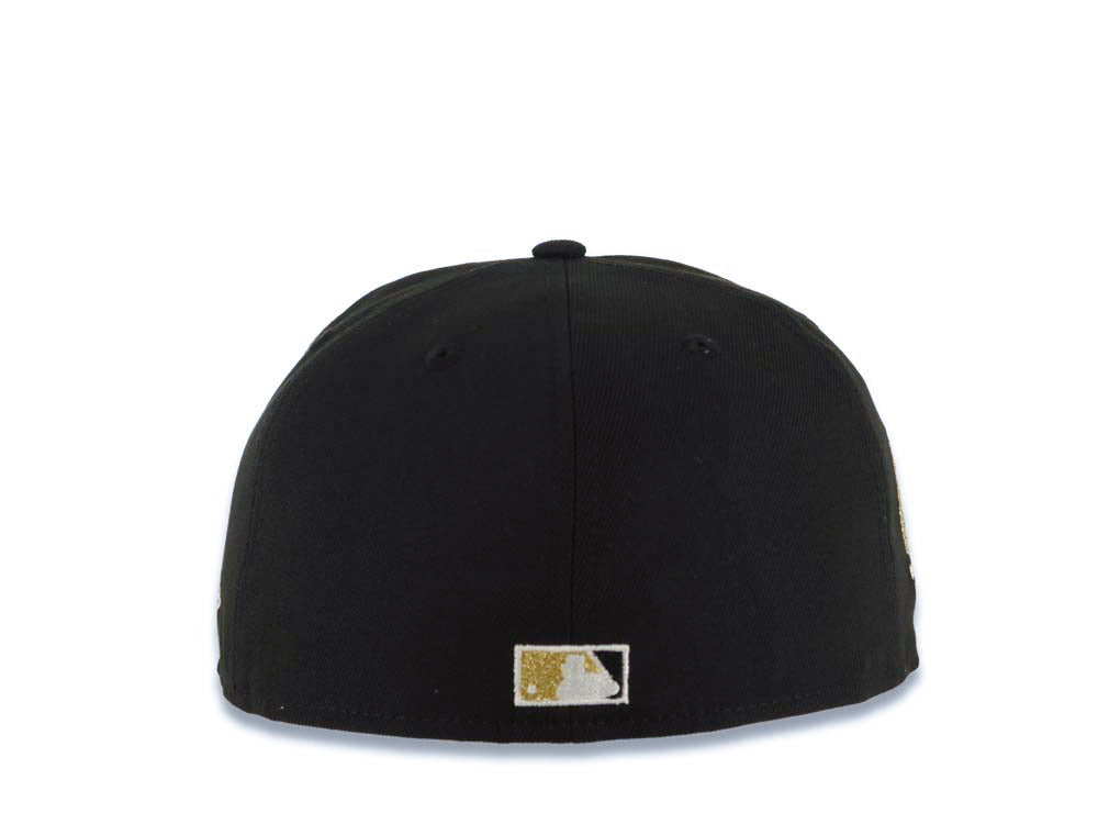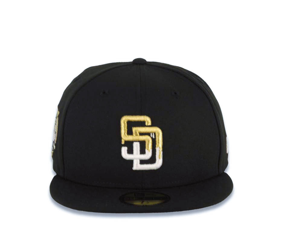 San Diego Padres New Era MLB 59FIFTY 5950 Fitted Cap Hat Black Crown/Visor White/Metallic Gold Drip Logo 40th Anniversary Side Patch Gray UV