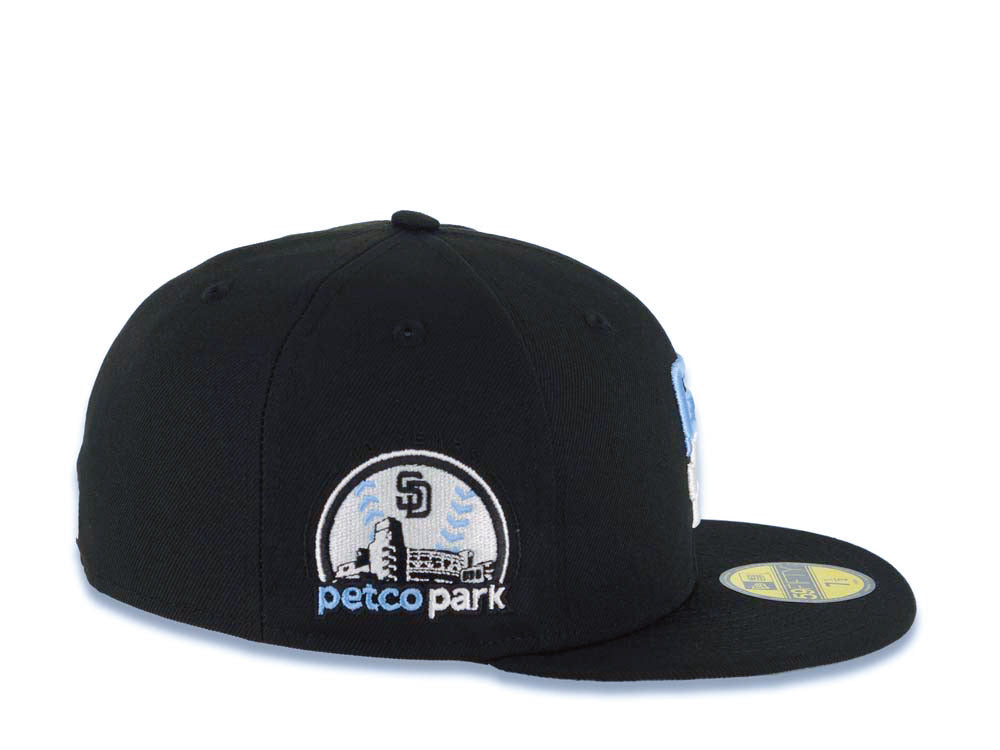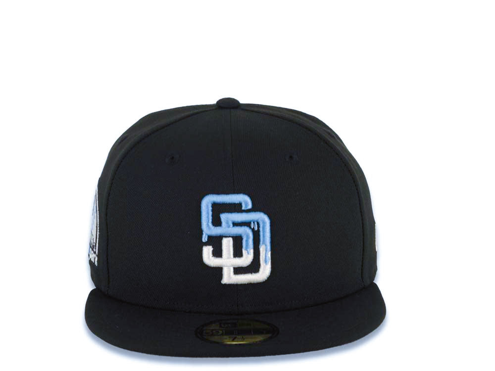 San Diego Padres New Era MLB 59FIFTY 5950 Fitted Cap Hat Black Crown/Visor White/Sky Blue Drip Paint Logo 10th Anniversary Petcopark Side Patch Gray UV