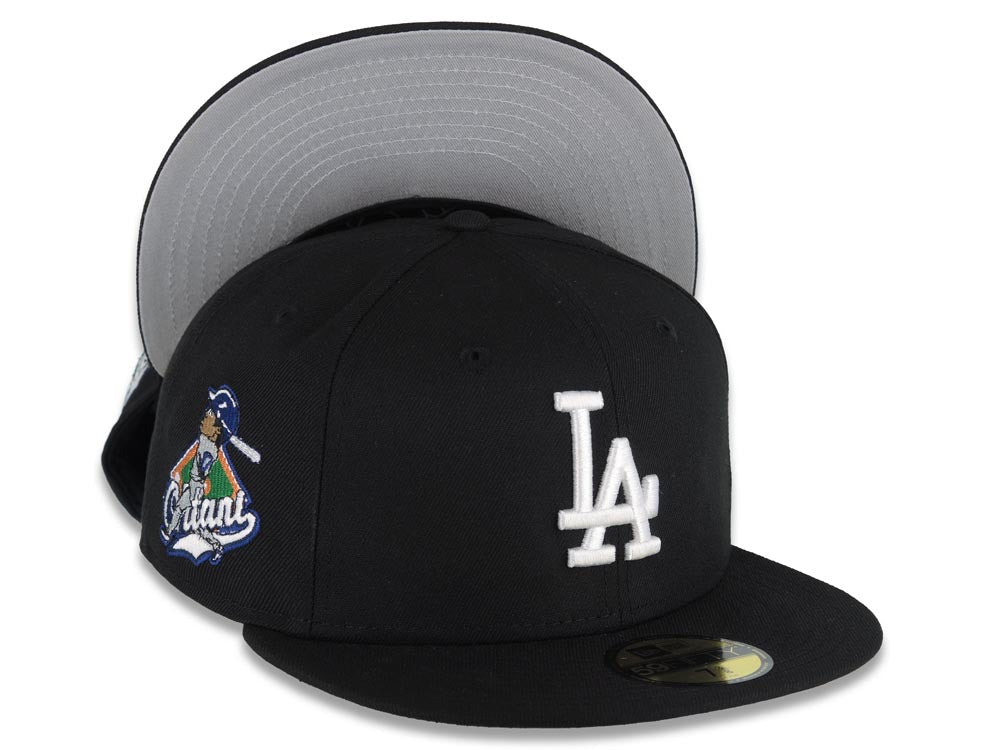 Los Angeles Dodgers New Era MLB 59FIFTY 5950 Fitted Cap Hat Black Crown/Visor White Logo Swinging Shohei Ohtani Side Patch (Gray UV)