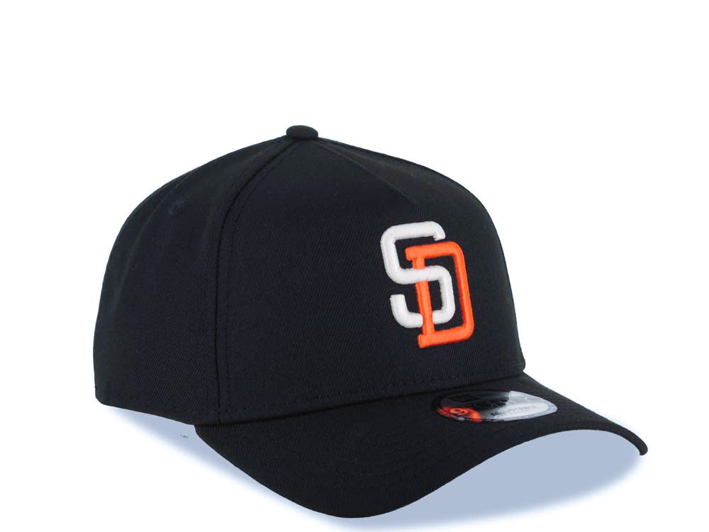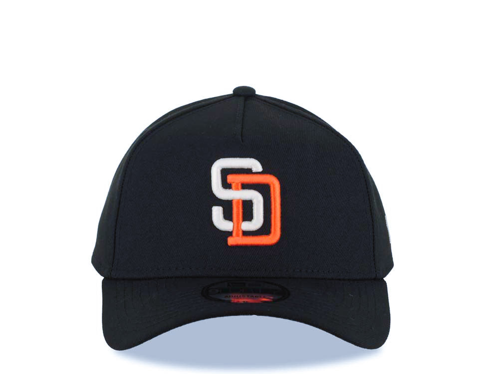 San Diego Padres New Era MLB 9FORTY 940 Adjustable A-Frame Cap Hat Black Crown/Visor Glow White/Orange Logo Gray UV