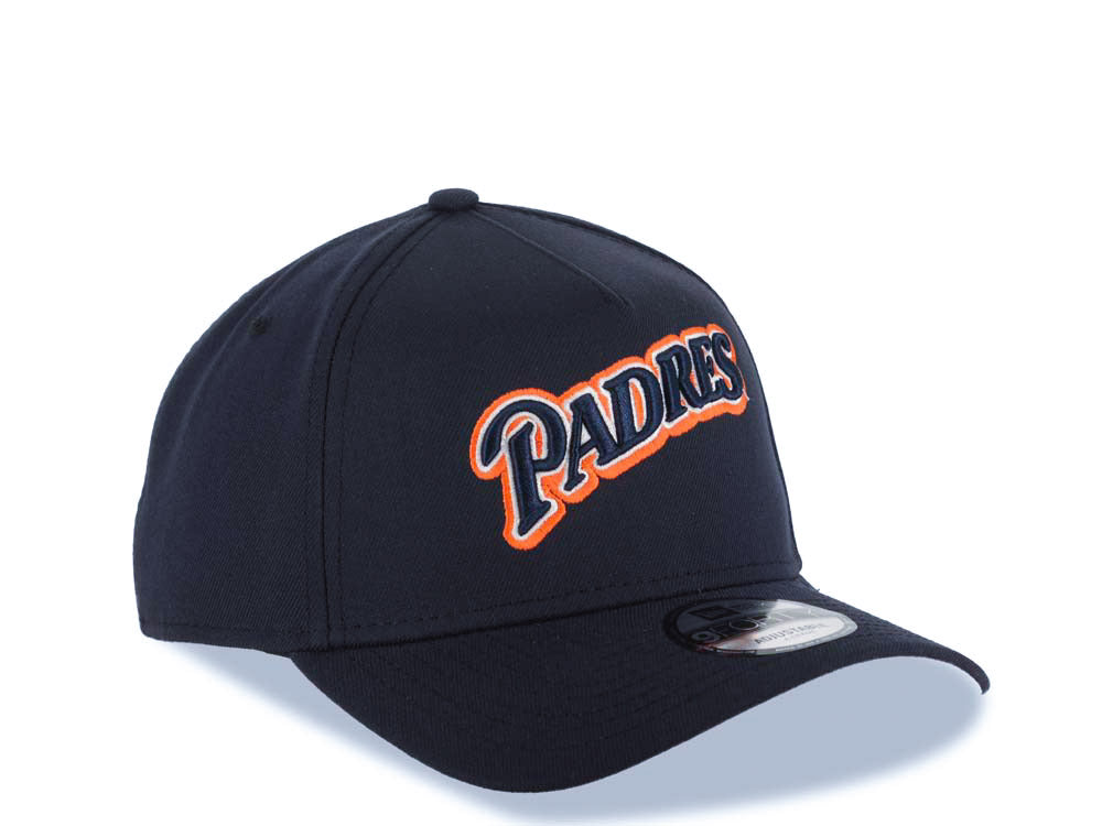 San Diego Padres New Era MLB 9FORTY 940 Adjustable A-Frame Cap Hat Navy Blue Crown/Visor Navy Blue/Orange/White Script Logo