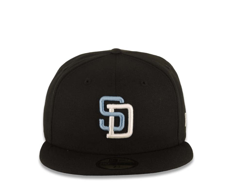 San Diego Padres New Era MLB 59FIFTY 5950 Fitted Cap Hat Black Crown/Visor Sky Blue/White Logo Sky Blue UV