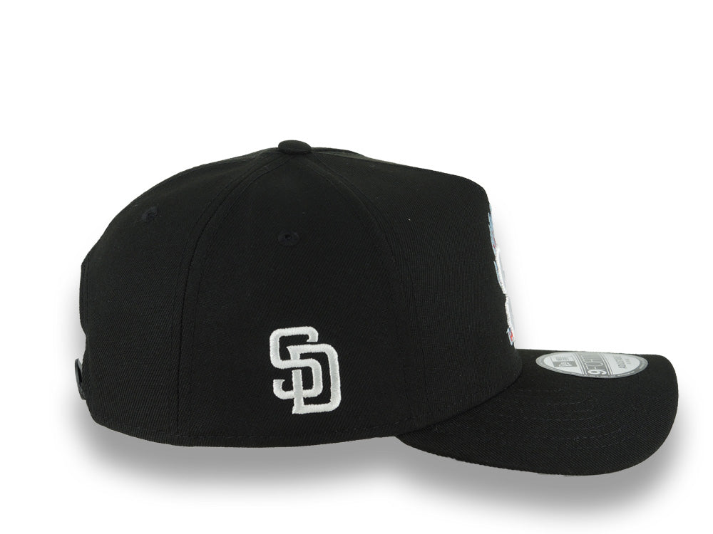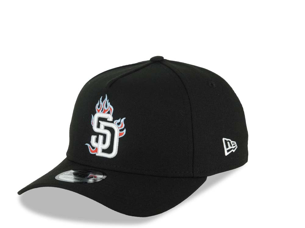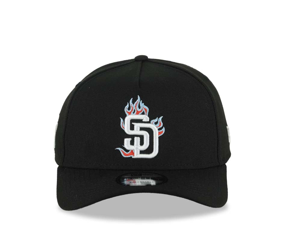San Diego Padres New Era MLB 9FORTY 940 Adjustable A-Frame Cap Hat Black Crown/Visor White With Red Fire Flame Logo Gray UV
