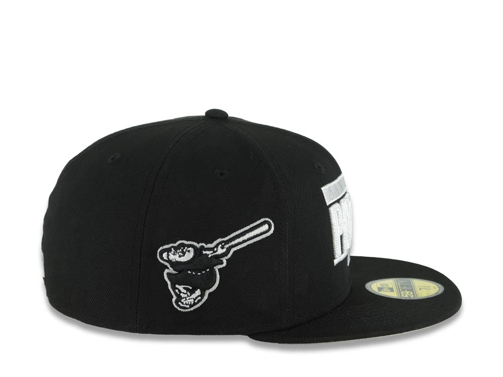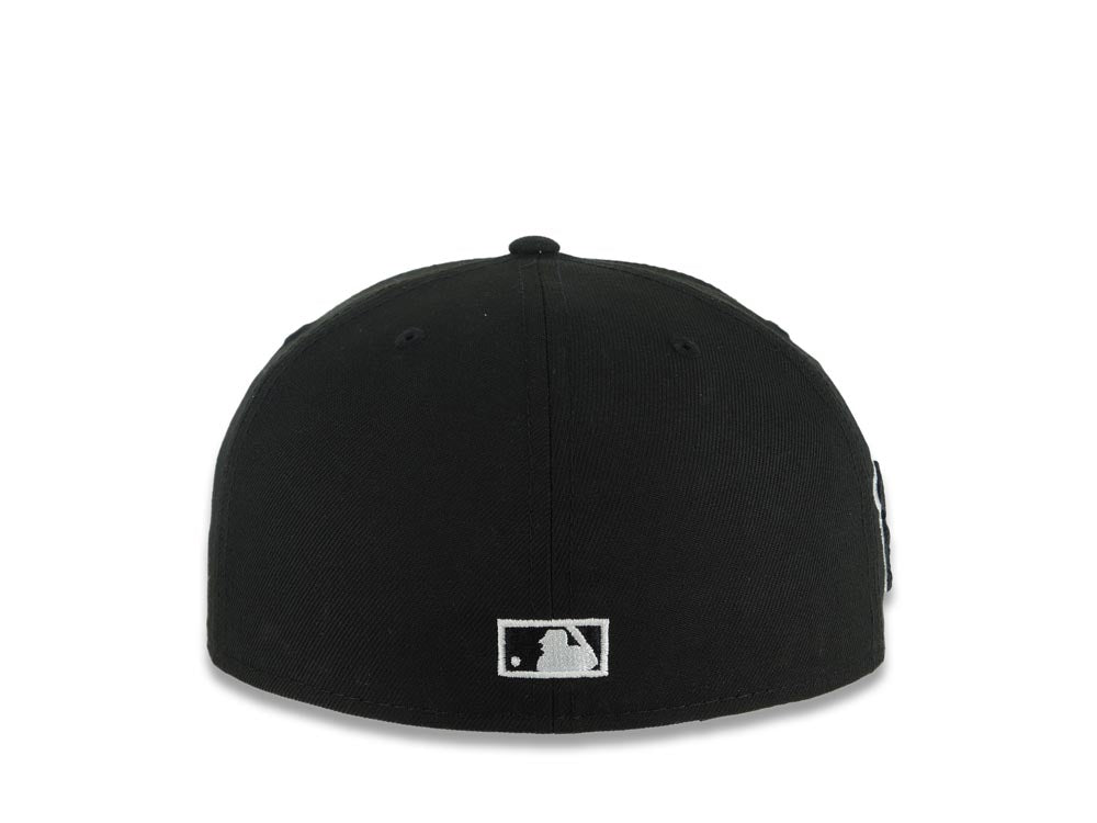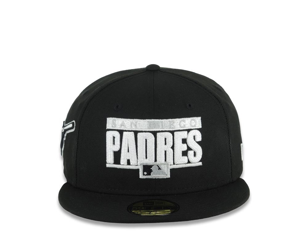 • Load image into Gallery viewer, San Diego Padres New Era MLB 59FIFTY 5950 Fitted Cap Hat Black Crown/Visor White Text Logo Swinging Friar Side Patch Gray UV