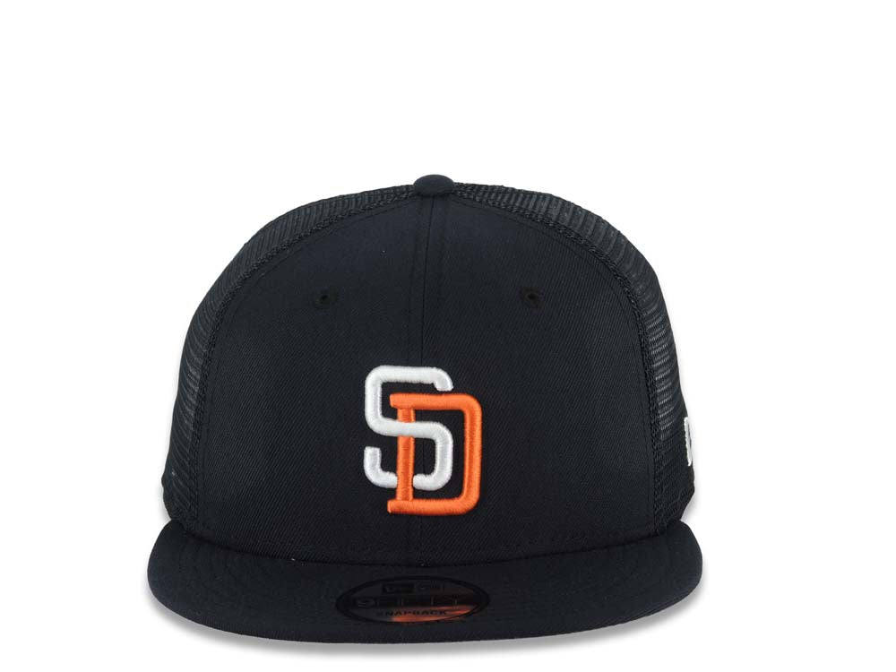 San Diego Padres New Era MLB 9FIFTY 950 Snapback Trucker/Mesh Cap Hat Black Crown/Visor White/Orange Logo Gray UV