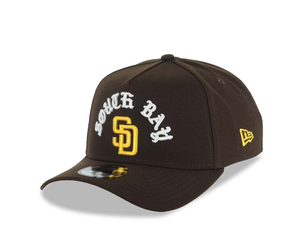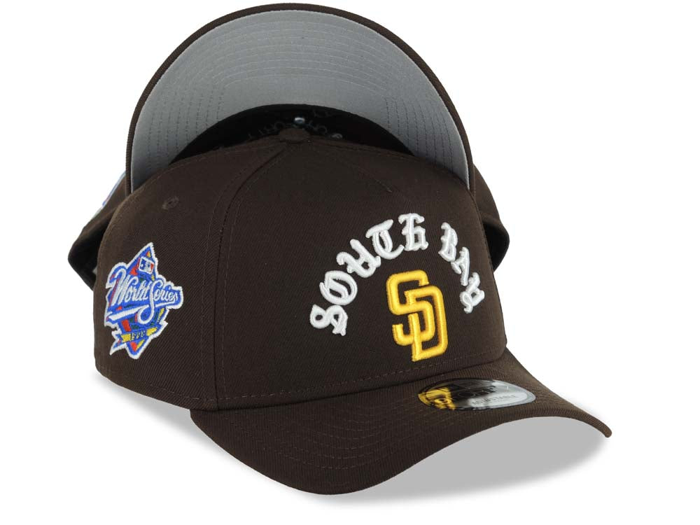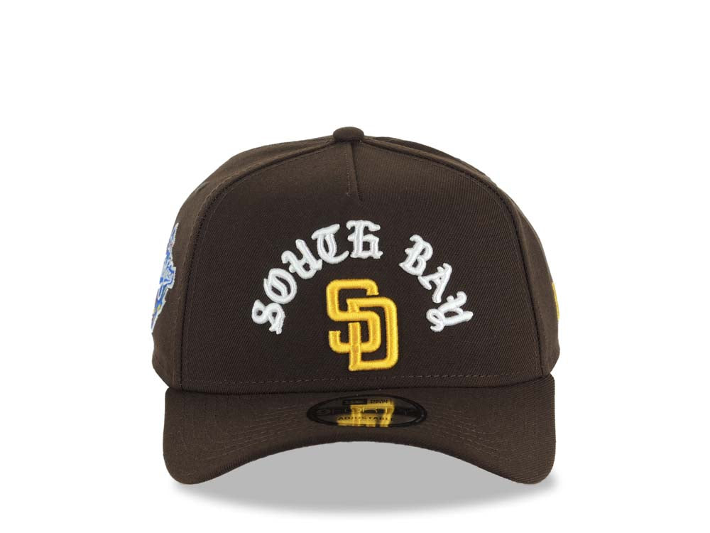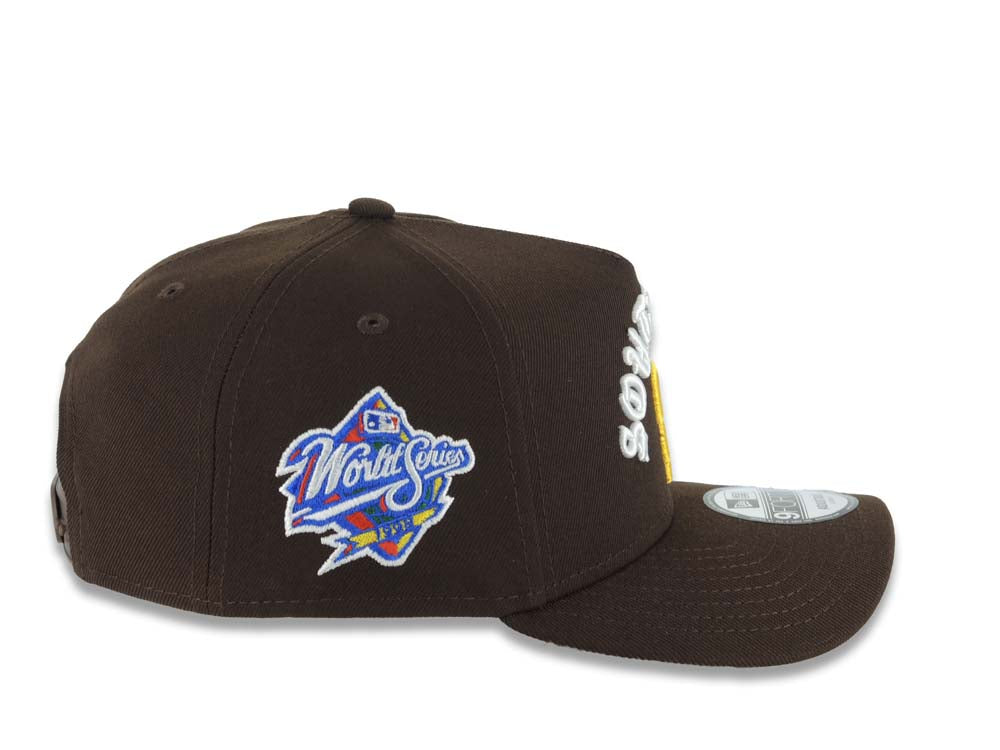 San Diego Padres New Era MLB 9FORTY 940 Adjustable A-Frame Cap Hat Brown Crown/Visor Yellow Logo With South Bay Script/Text 1998 World Series Side Patch