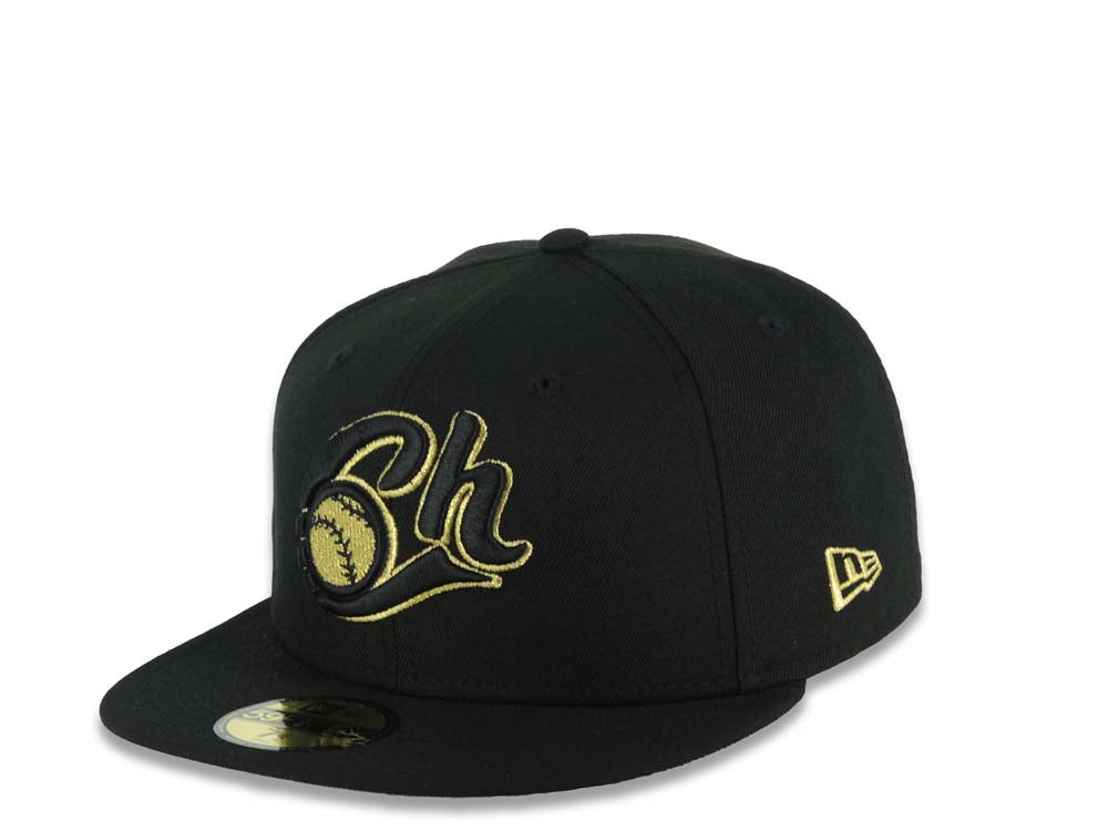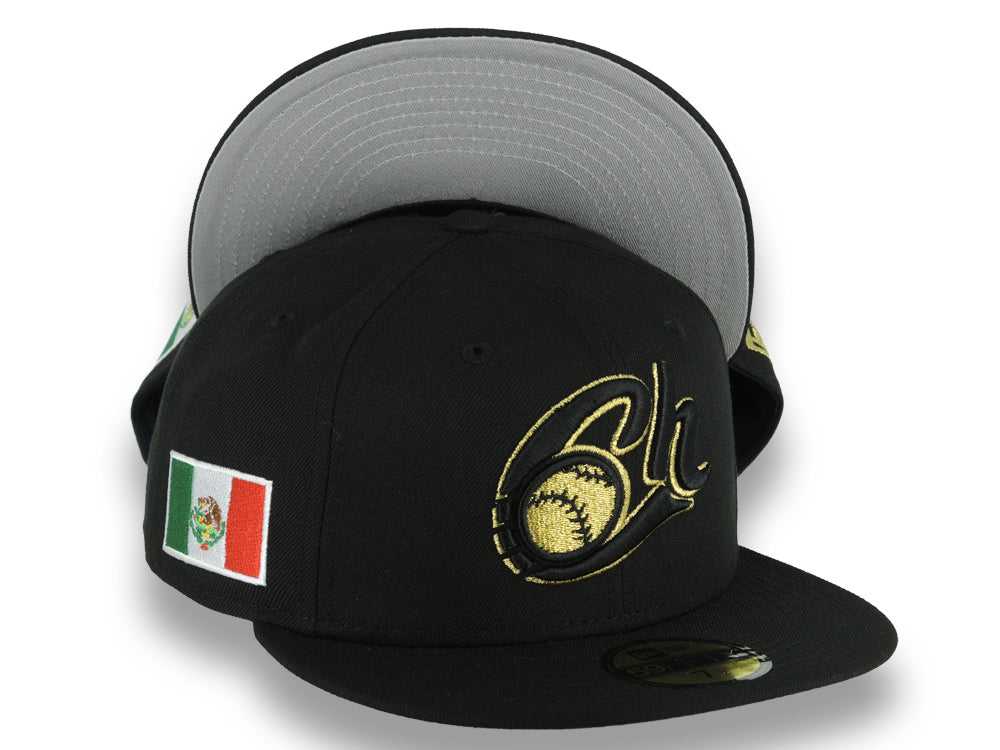 Charros de Jalisco New Era LMP 59FIFTY 5950 Fitted Cap Hat Black Crown/Visor Black/Metallic Gold Logo Mexico Flag Side Patch Gray UV