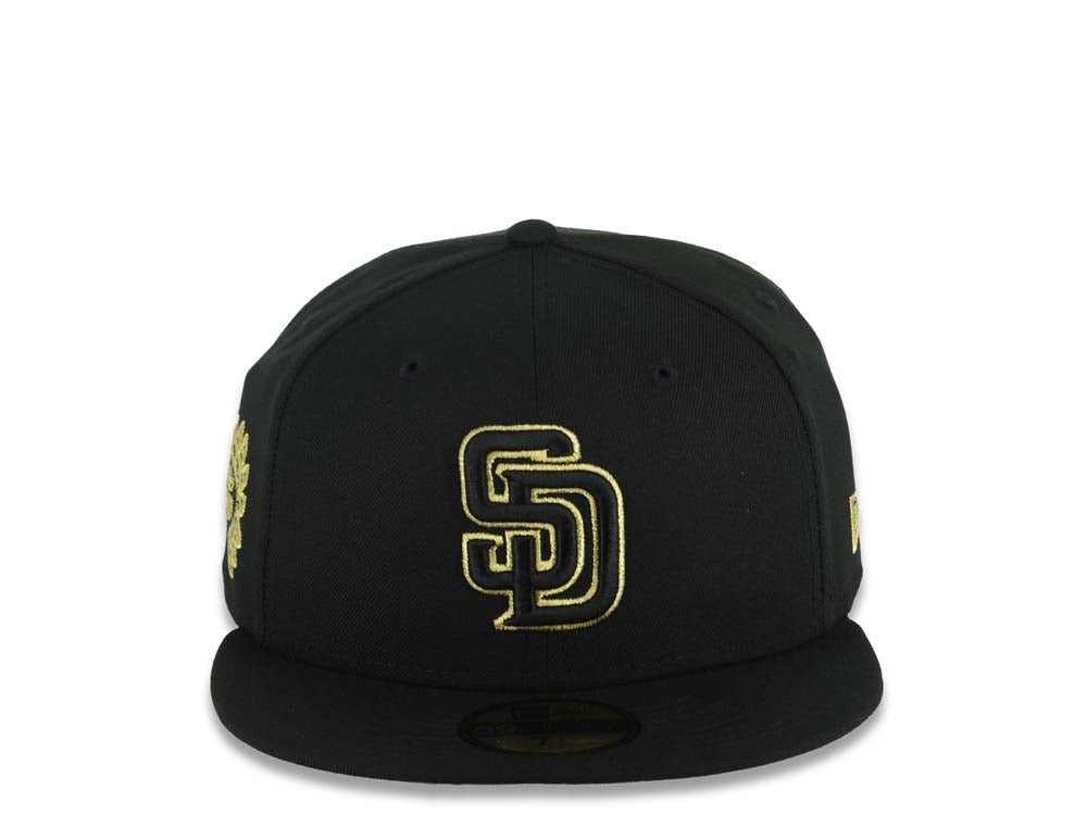 San Diego Padres New Era MLB 59FIFTY 5950 Fitted Cap Hat Black Crown/Visor Black/Metallic Gold Logo Mexico Eagle Side Patch Gray UV