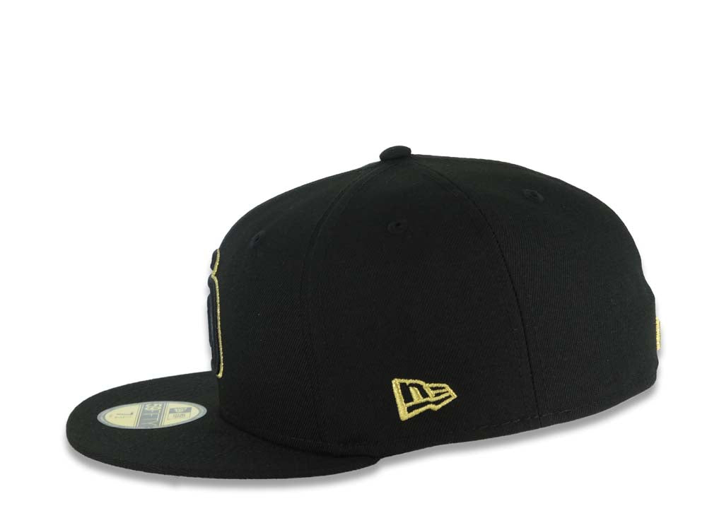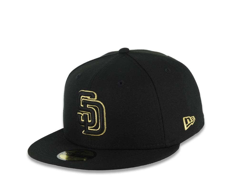 • Load image into Gallery viewer, San Diego Padres New Era MLB 59FIFTY 5950 Fitted Cap Hat Black Crown/Visor Black/Metallic Gold Logo Mexico Eagle Side Patch Gray UV