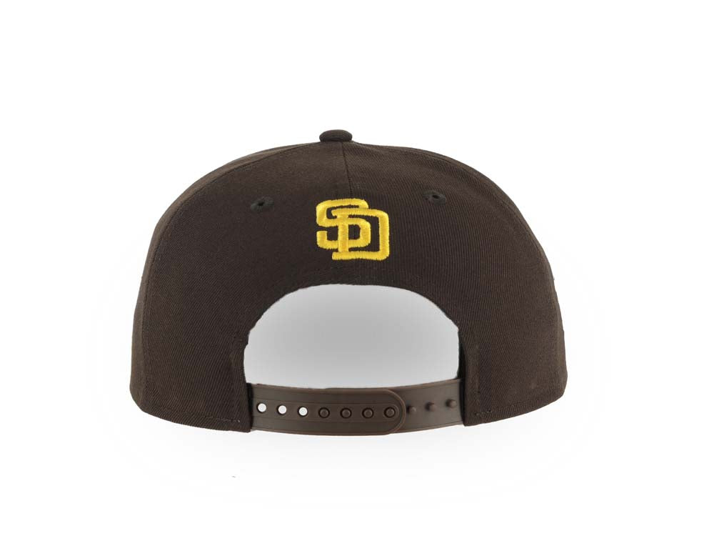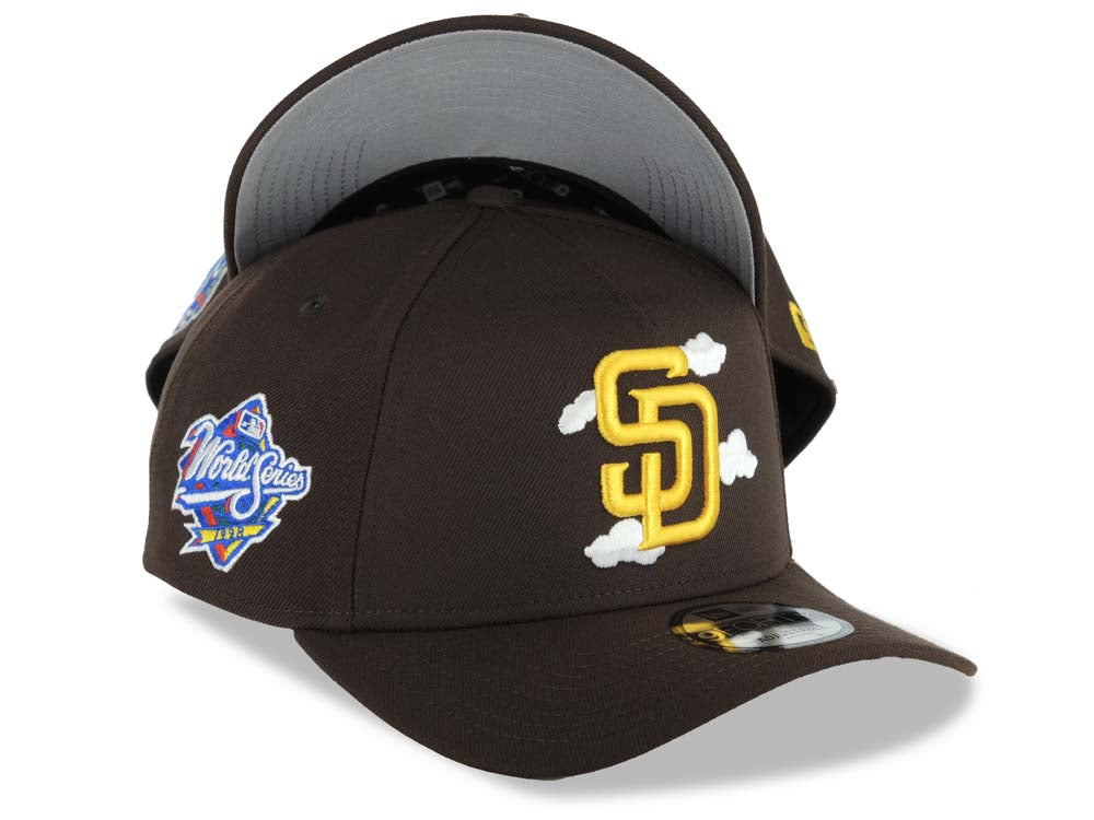 San Diego Padres New Era MLB 9FORTY 940 Adjustable A-Frame Cap Hat Brown Crown/Visor Yellow Logo White Clouds 1998 World Series Side Patch Gray UV