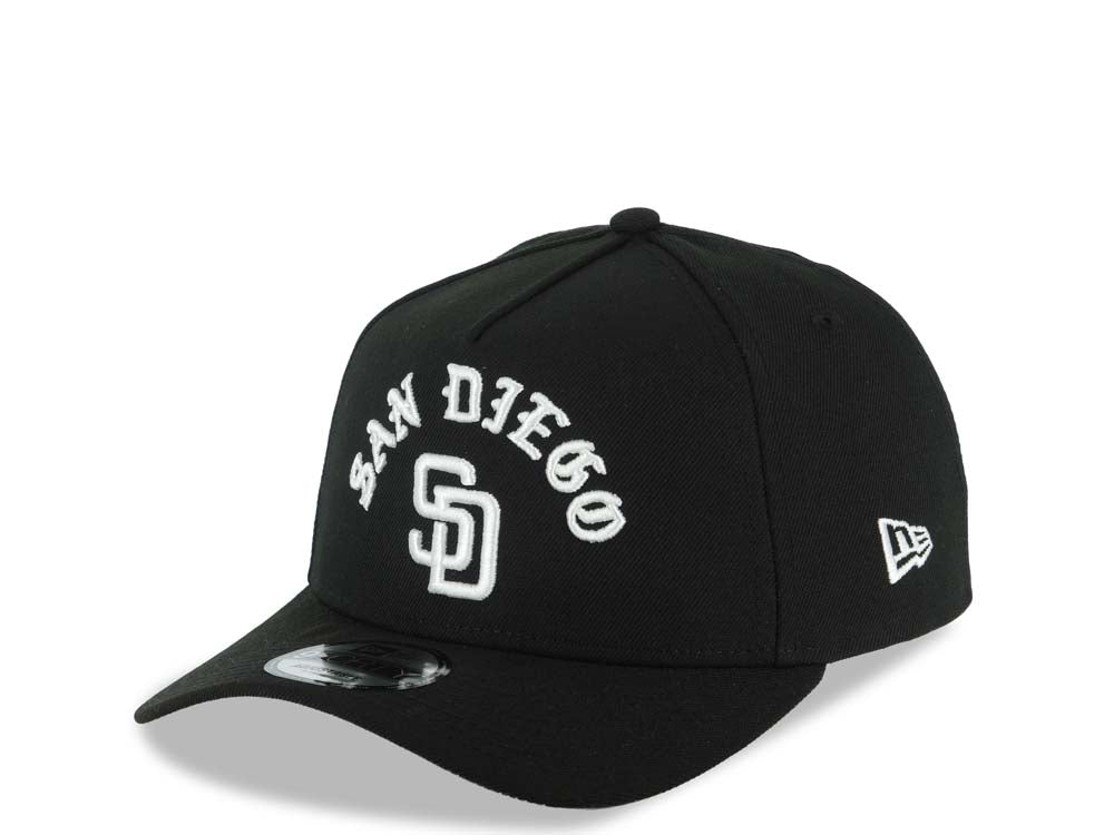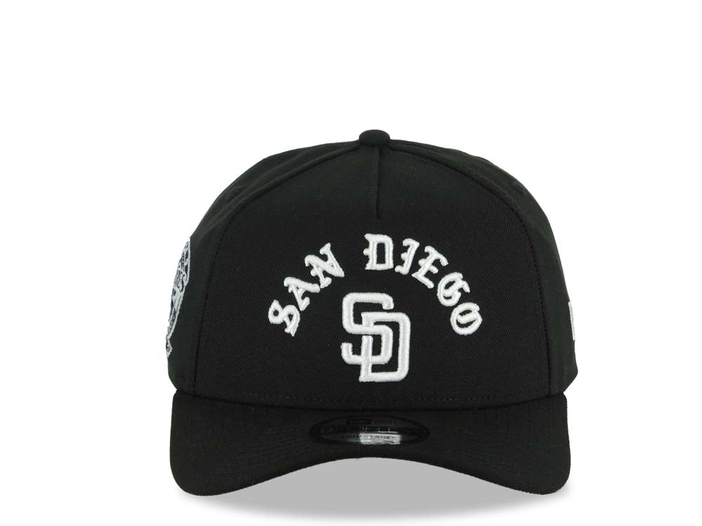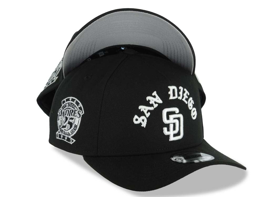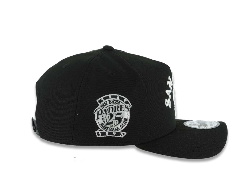 San Diego Padres New Era MLB 9FORTY 940 Adjustable A-Frame Cap Hat Black Crown/Visor White With Text/Script Logo 25th Anniversary Side Patch Gray UV