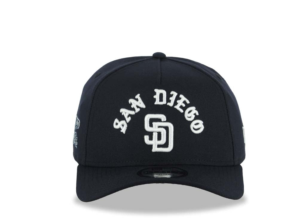 San Diego Padres New Era MLB 9FORTY 940 Adjustable A-Frame Cap Hat Navy Blue Crown/Visor White With Text/Script Logo 1984 World Series Side Patch Gray UV