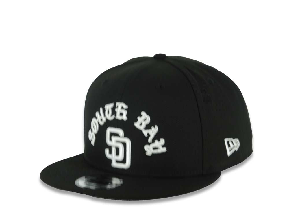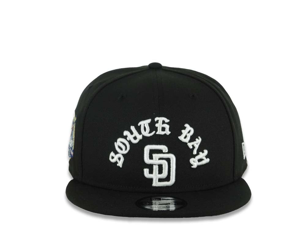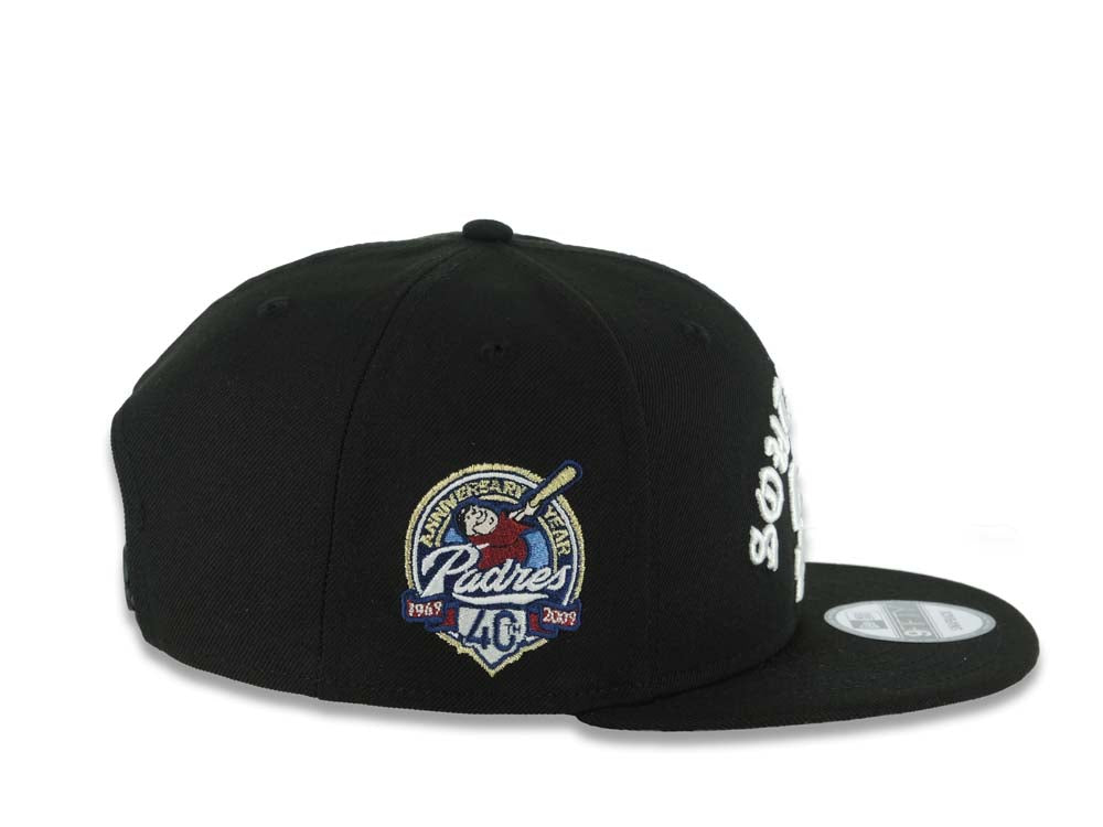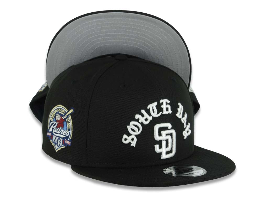 San Diego Padres New Era MLB 9FIFTY 950 Snapback Cap Hat Black Crown/Visor White South Bay Text/Script Logo 40th Anniversary Side Patch Gray UV