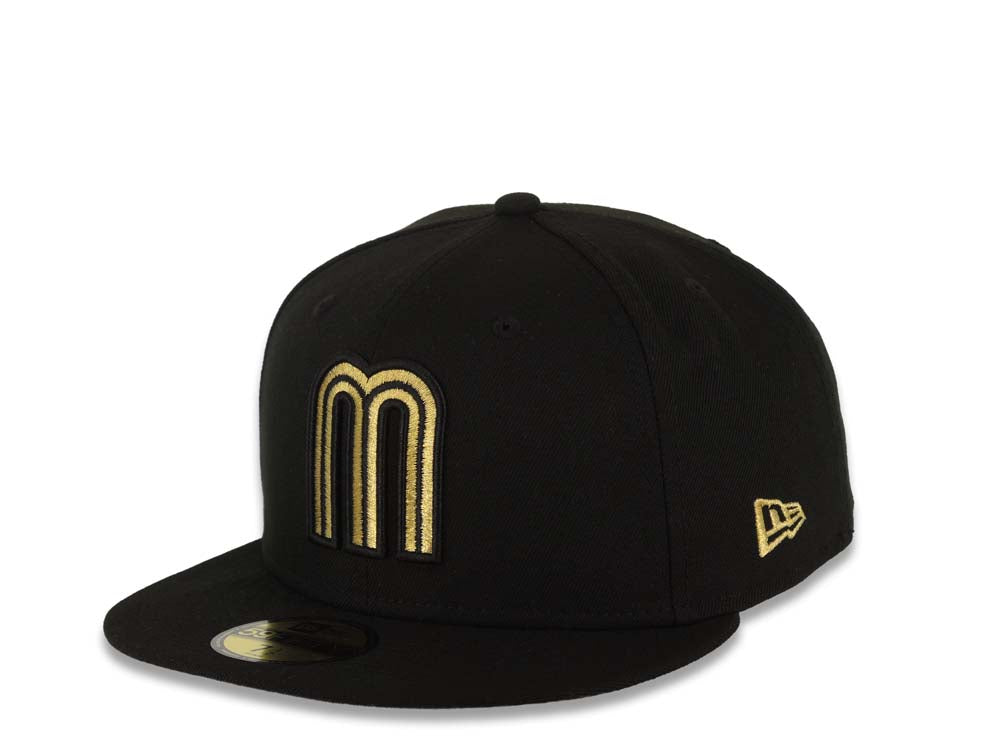 Mexico New Era WBC World Baseball Classic 59FIFTY 5950 Fitted Cap Hat Black Crown/Visor Metallic Gold/Black Logo Mexico Side Patch Gray UV