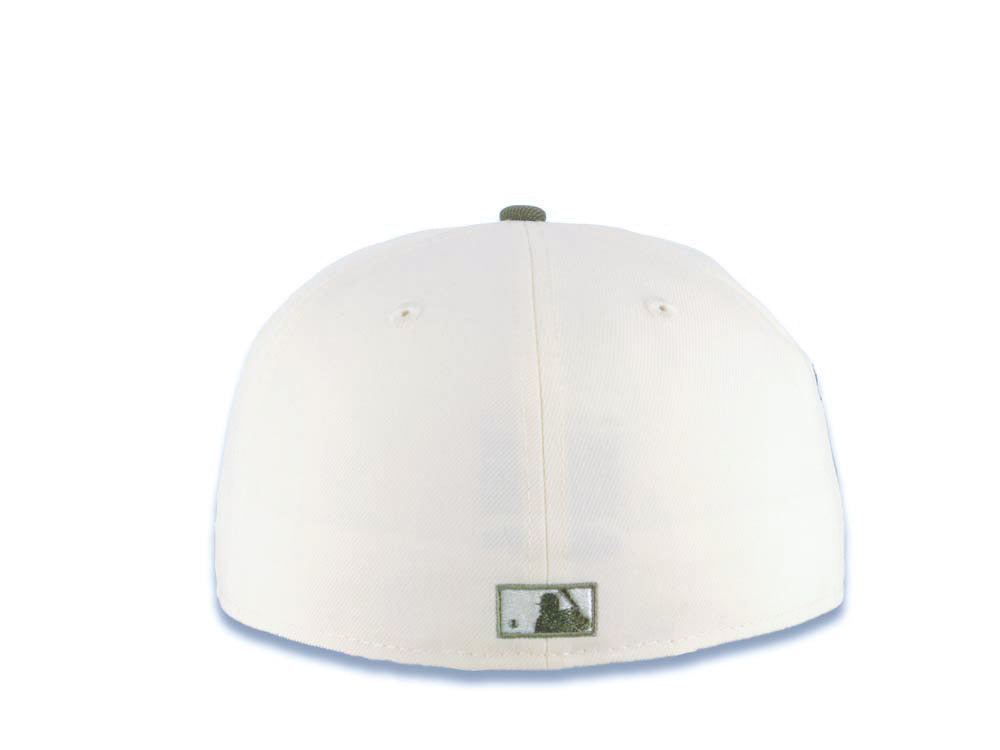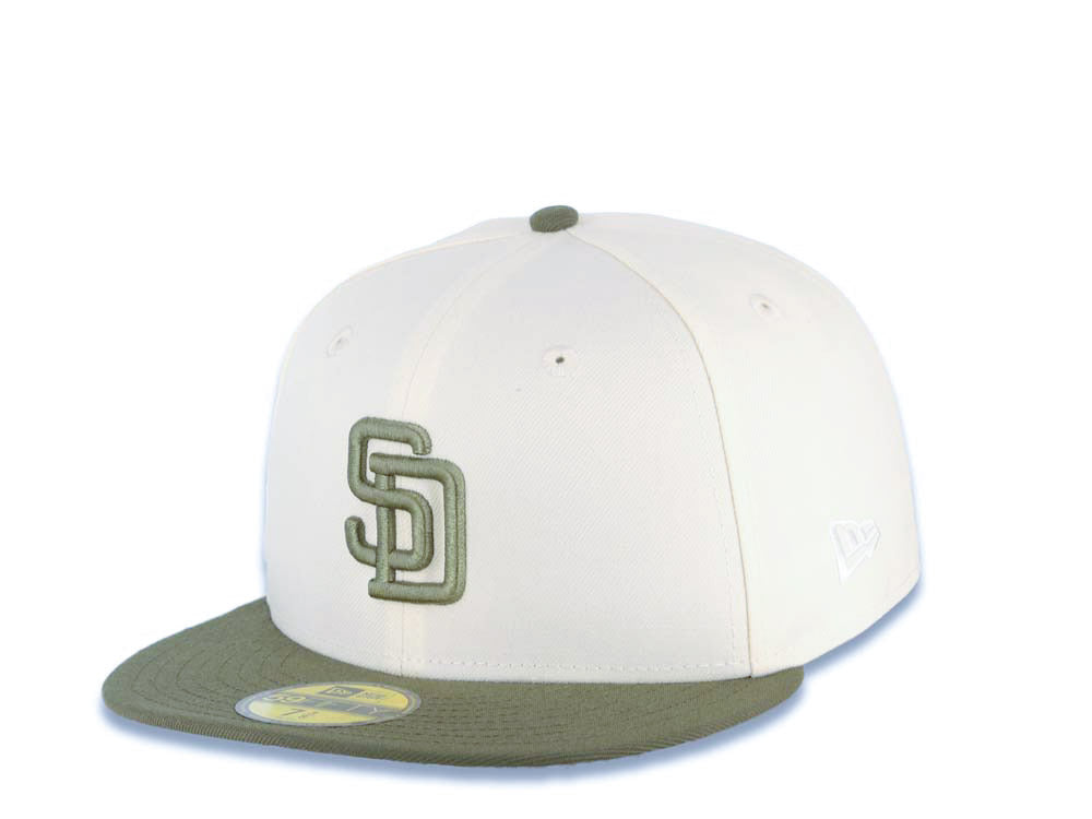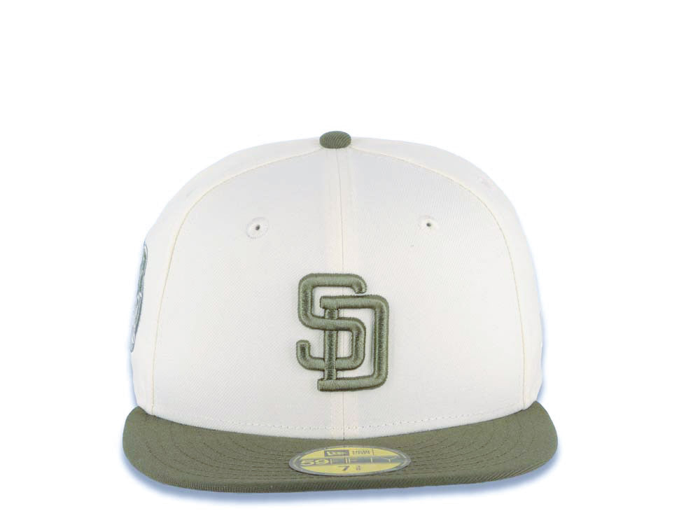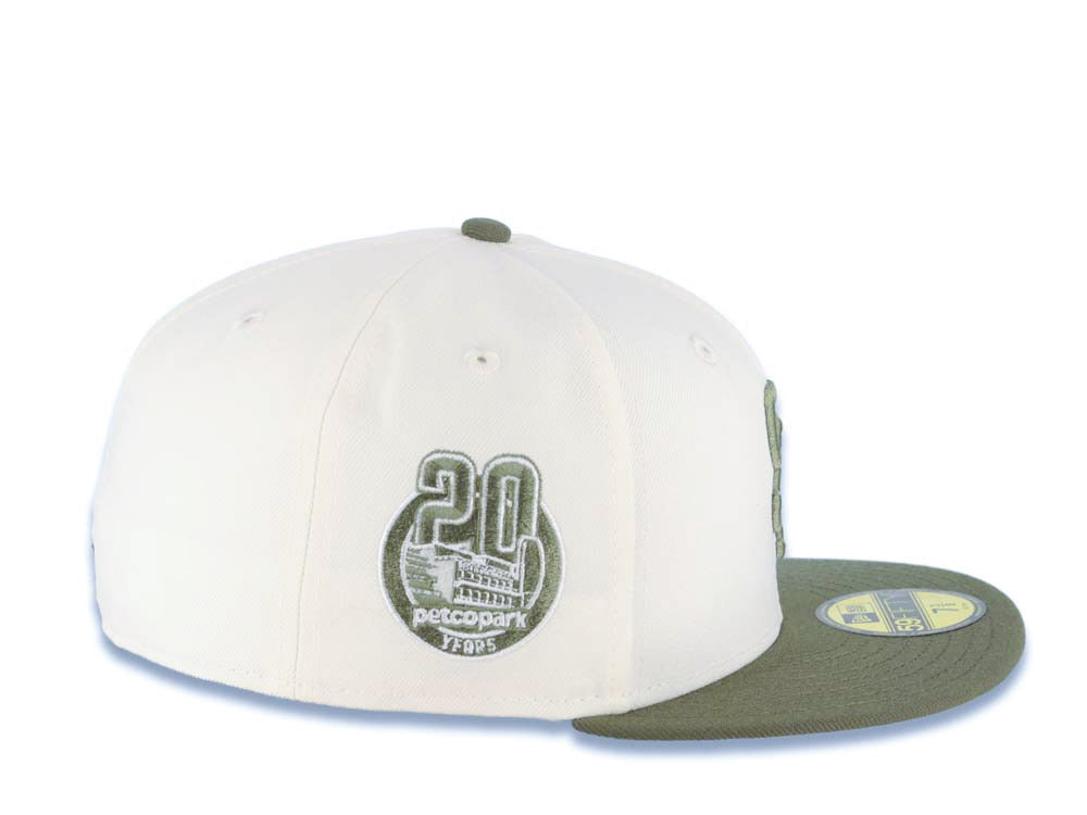 San Diego Padres New Era MLB 59FIFTY 5950 Fitted Cap Hat Cream Crown Olive Green Visor Olive Green Logo 20th Anniversary Petco Park Side Patch