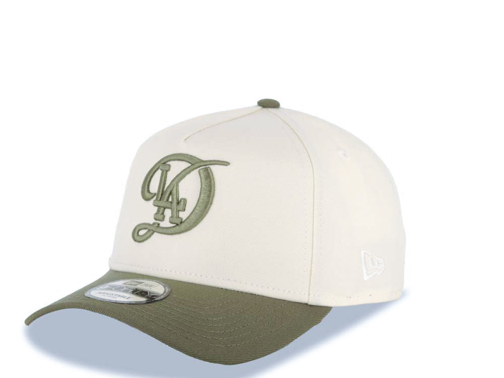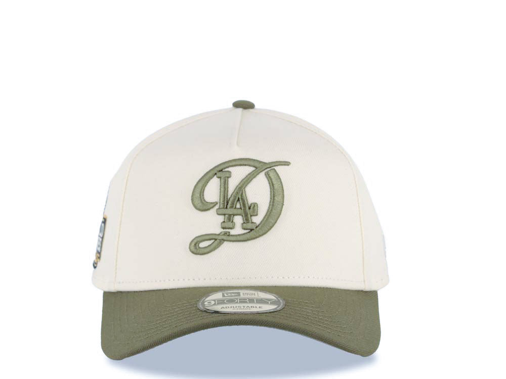 Los Angeles Dodgers New Era MLB 9FORTY 940 Adjustable A-Frame Cap Hat Cream Crown Green Visor Olive City Connect Logo 2024 World Series Side Patch