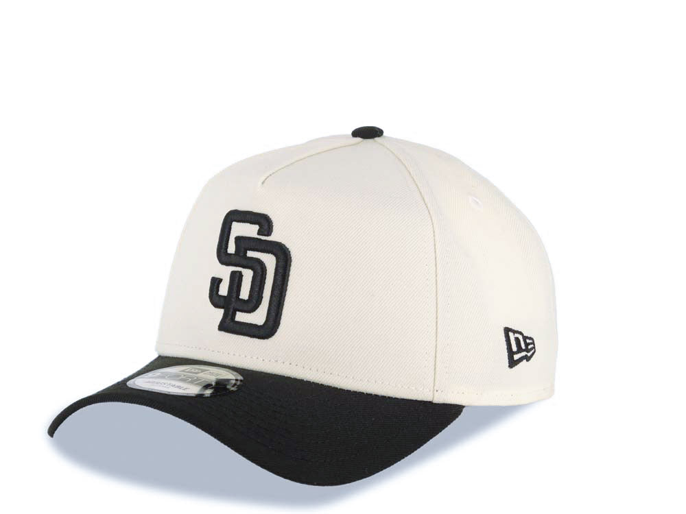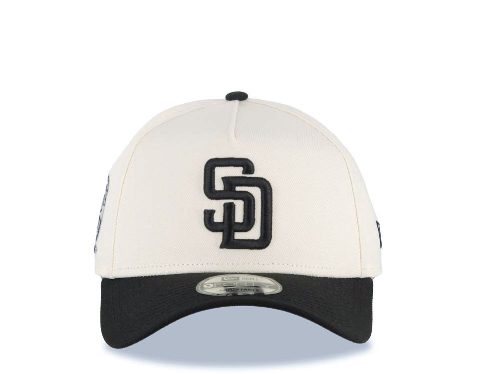 San Diego Padres New Era MLB 9FORTY 940 Adjustable A-Frame Cap Hat Cream Crown Black Visor Black Logo 25th Anniversary Side Patch Gray UV
