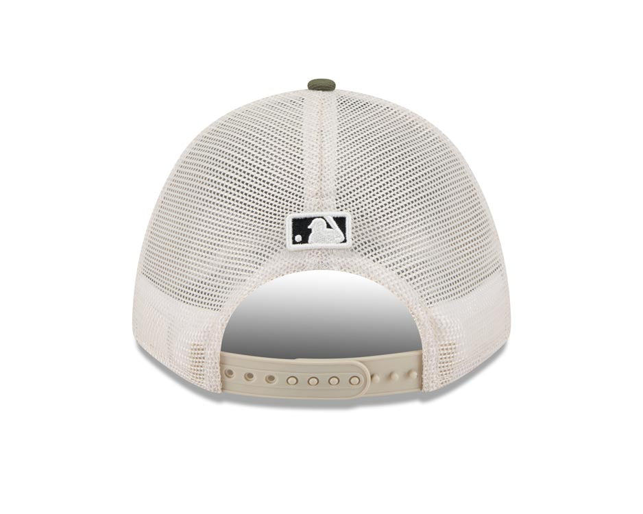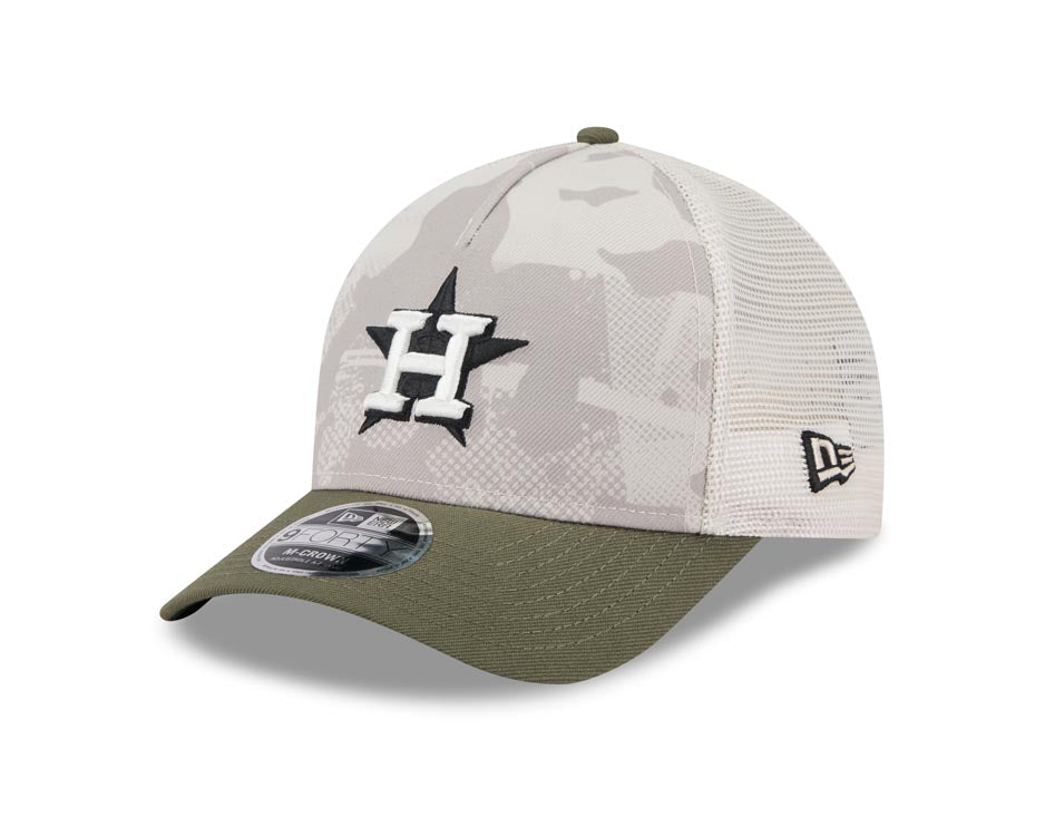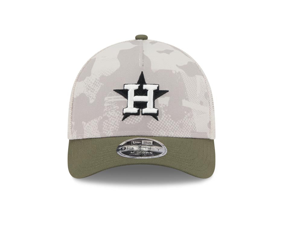 Houston Astros New Era MLB 9FORTY 940 Adjustable Mesh M-Crown Cap Hat White Camo Crown Olive Green Visor White/Black Logo (2025 Armed Forces Day)