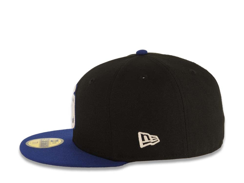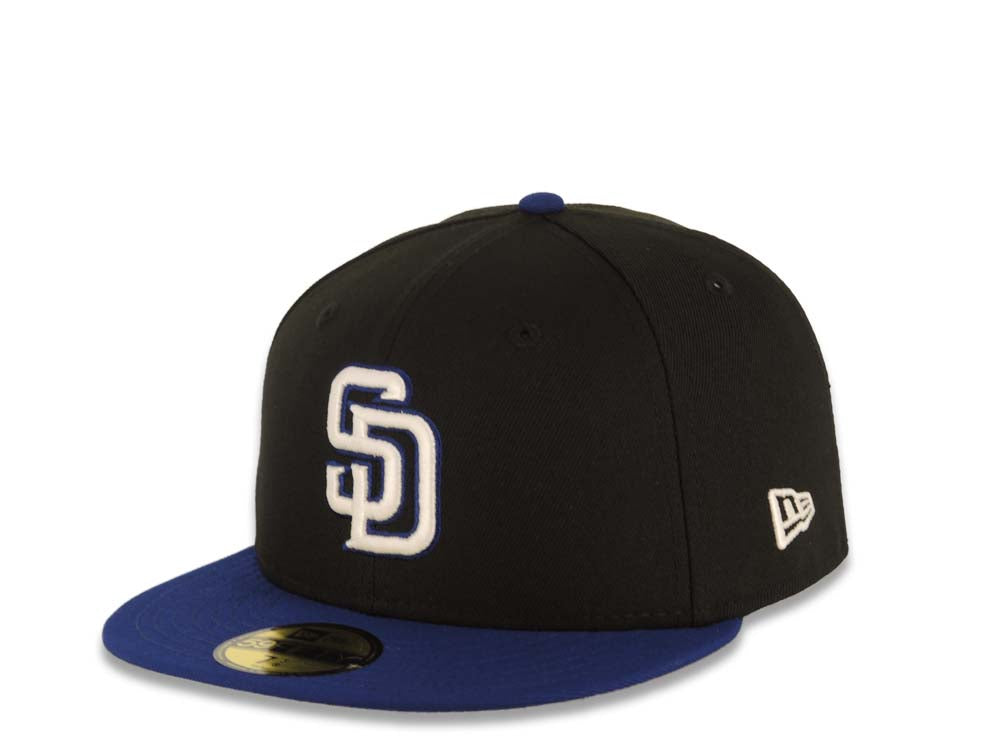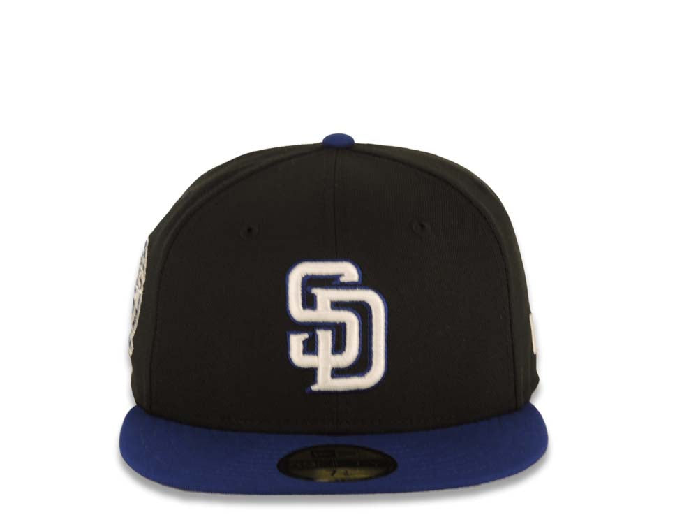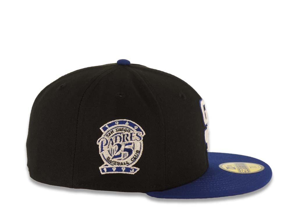 San Diego Padres New Era MLB 59FIFTY 5950 Fitted Cap Hat Black Crown Royal Blue Visor White/Blue Logo 25th Anniversary Side Patch Gray UV
