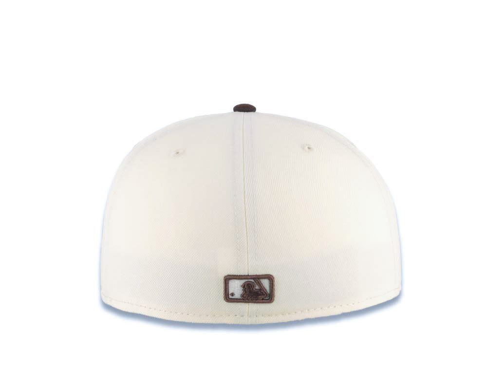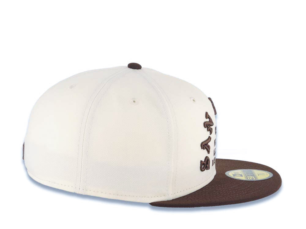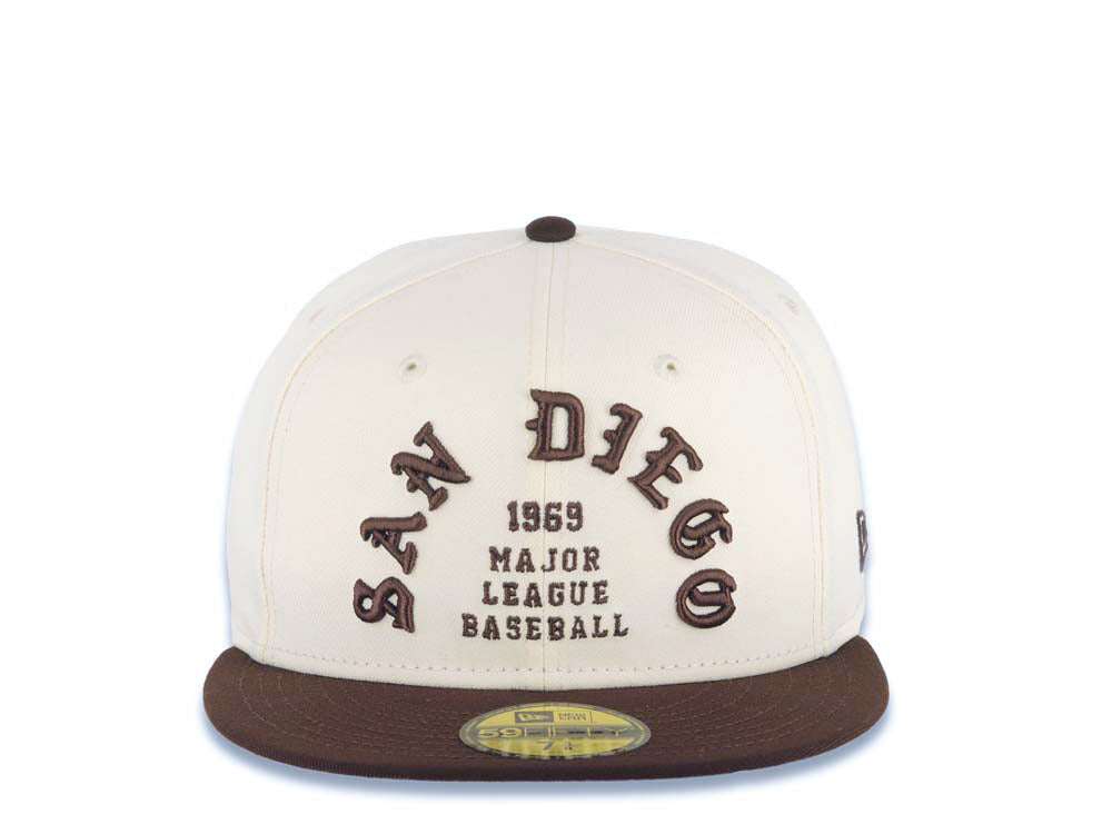 San Diego Padres New Era MLB 59FIFTY 5950 Fitted Cap Hat Cream Crown Brown Visor Brown Script Logo 1969 Major League Baseball Gray UV