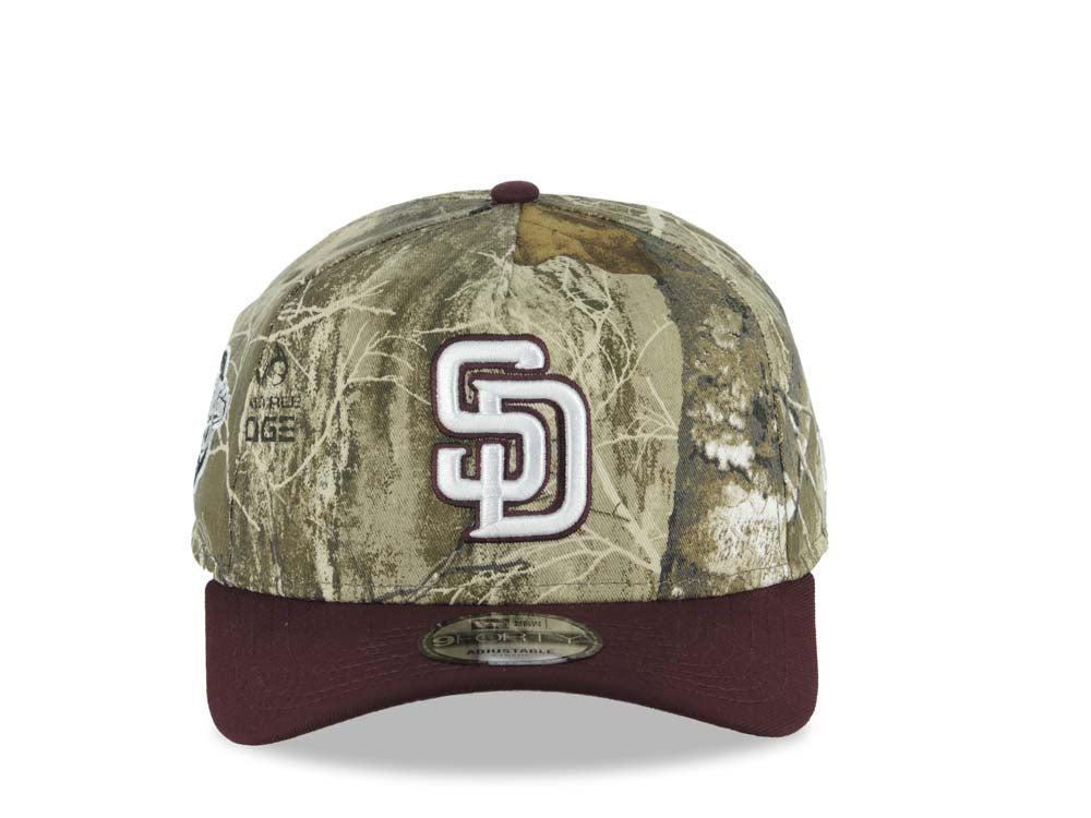 San Diego Padres New Era MLB 9FORTY 940 Adjustable A-Frame Cap Hat Real Tree Edge Camo Crown Maroon Visor White/Maroon Logo 1998 World Series Side Patch