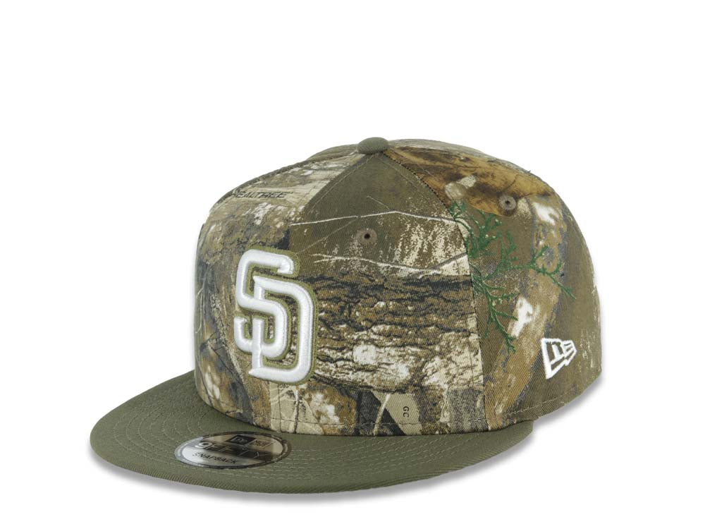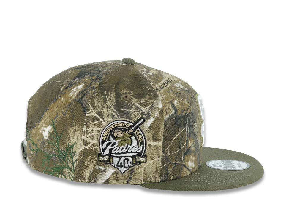 San Diego Padres New Era MLB 9FIFTY 950 Snapback Cap Hat Real Tree Edge Camo Crown Olive Green Visor White/Olive Green Logo 40th Anniversary Side Patch