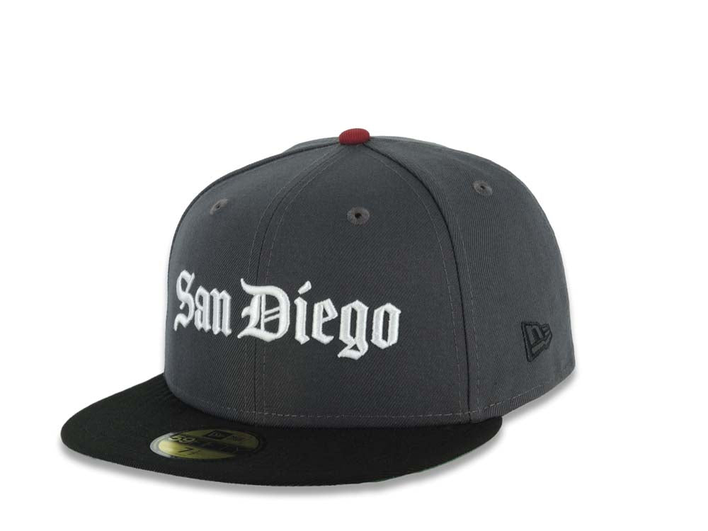 • Load image into Gallery viewer, San Diego Padres New Era MLB 59FIFTY 5950 Fitted Cap Hat Dark Gray Crown Black Visor White Script/Text Logo 1998 World Series Side Patch Green UV
