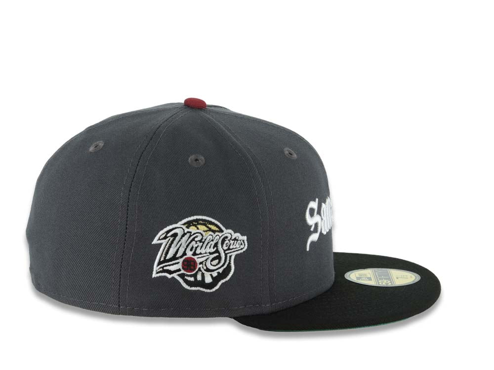 San Diego Padres New Era MLB 59FIFTY 5950 Fitted Cap Hat Dark Gray Crown Black Visor White Script/Text Logo 1998 World Series Side Patch Green UV