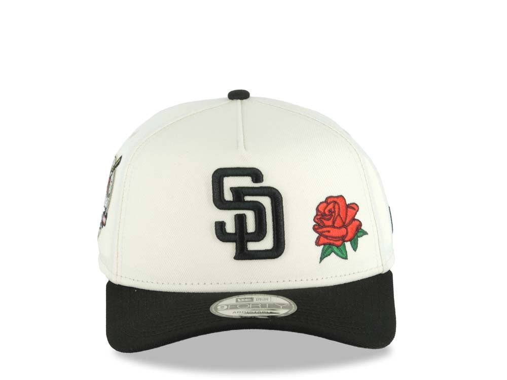 San Diego Padres New Era MLB 9FORTY 940 Adjustable A-Frame Cap Hat Cream Crown Black Visor Black Logo With Red Rose 40th Anniversary Side Patch Gray UV