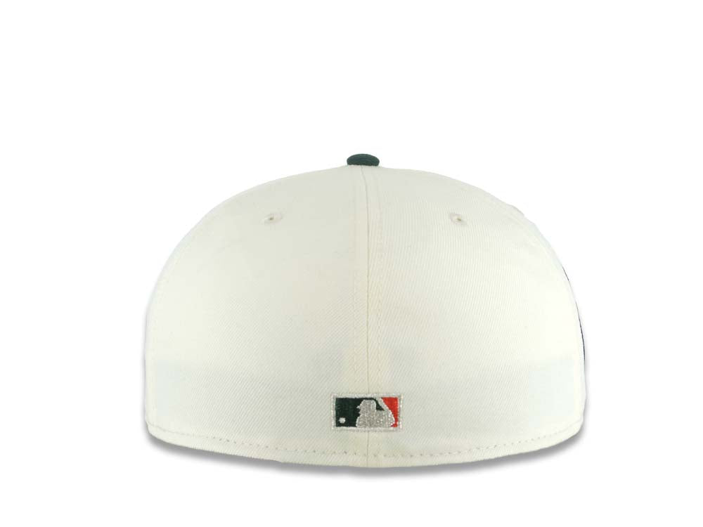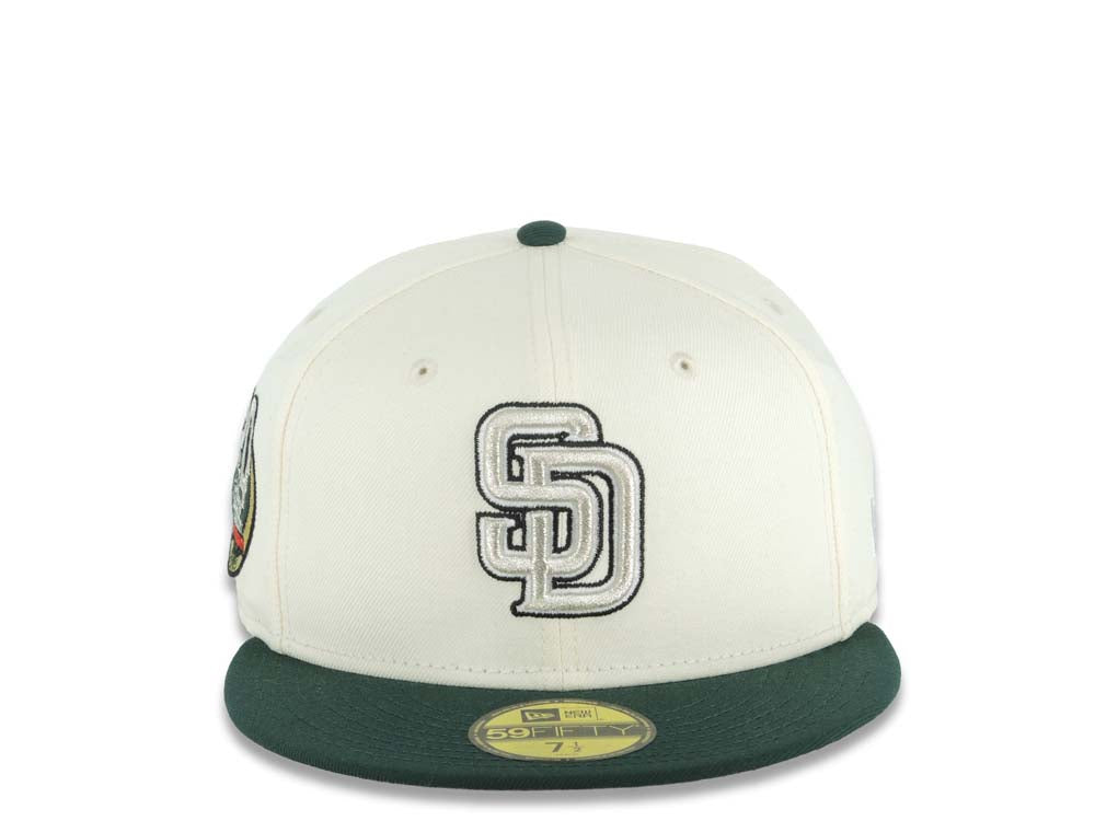 San Diego Padres New Era MLB 59FIFTY 5950 Fitted Cap Hat Cream Crown Dark Green Visor White/Metallic Silver/Black Logo 20th Anniversary Petco Park Side Patch
