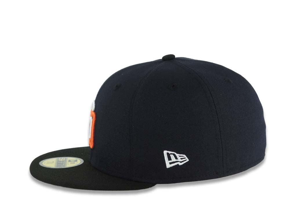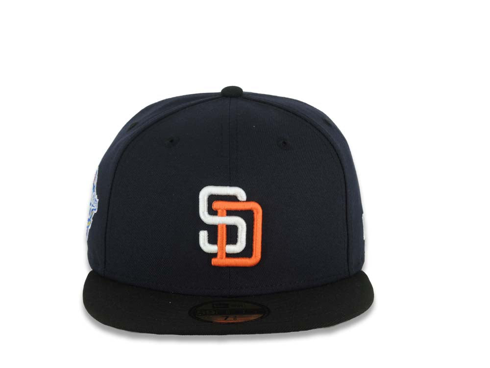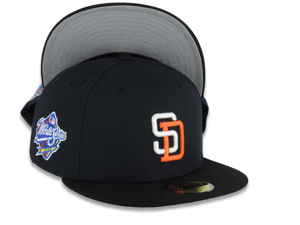 San Diego Padres New Era MLB 59FIFTY 5950 Fitted Cap Hat Navy Blue Crown Black Visor White/Orange Logo 1998 World Series Side Patch Gray UV