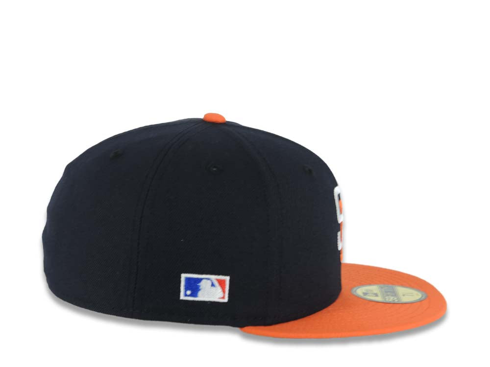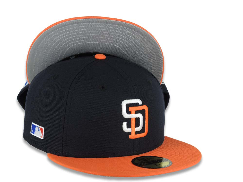 San Diego Padres New Era MLB 59FIFTY 5950 Fitted Cap Hat Navy Blue Crown Orange Visor White/Orange Logo Batterman Batty Side Patch Gray UV