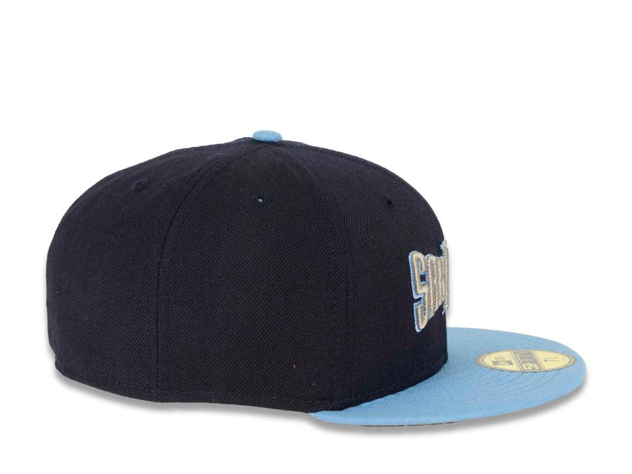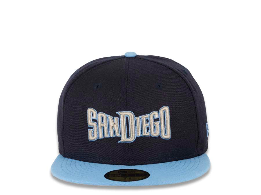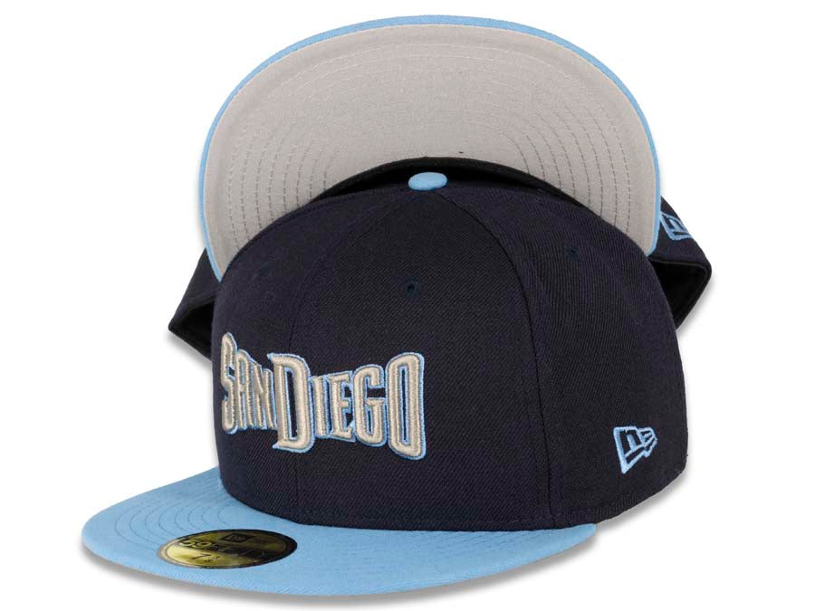 San Diego Padres New Era MLB 59FIFTY 5950 Fitted Cap Hat Navy Crown Sky Blue Visor Gray/Sky Blue “Text” Logo