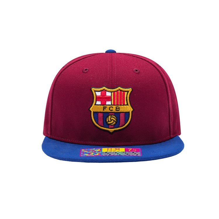 FC Football Club Barcelona (FCB) Fitted Soccer Cap Hat Burgundy Crown Royal Blue Visor Team Color Logo