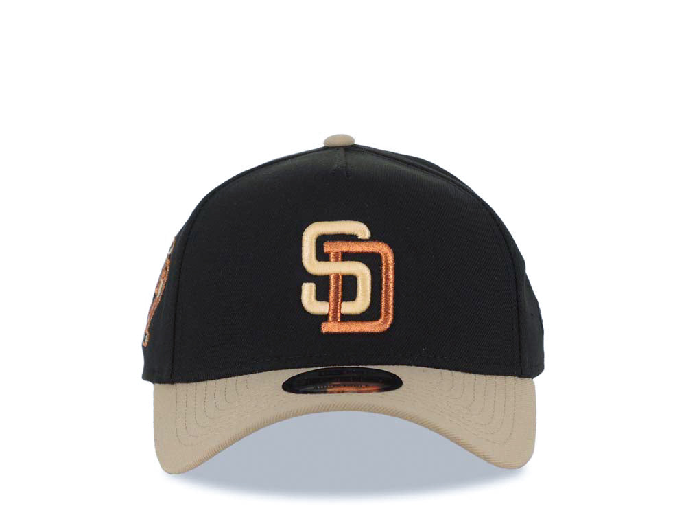 San Diego Padres New Era MLB 9FORTY 940 Adjustable A-Frame Cap Hat Black Crown Wheat Visor Wheat/Metallic Bronze Logo 25th Anniversary Side Patch