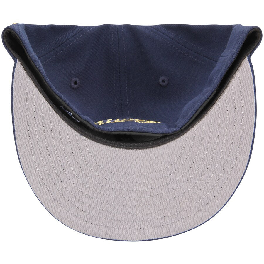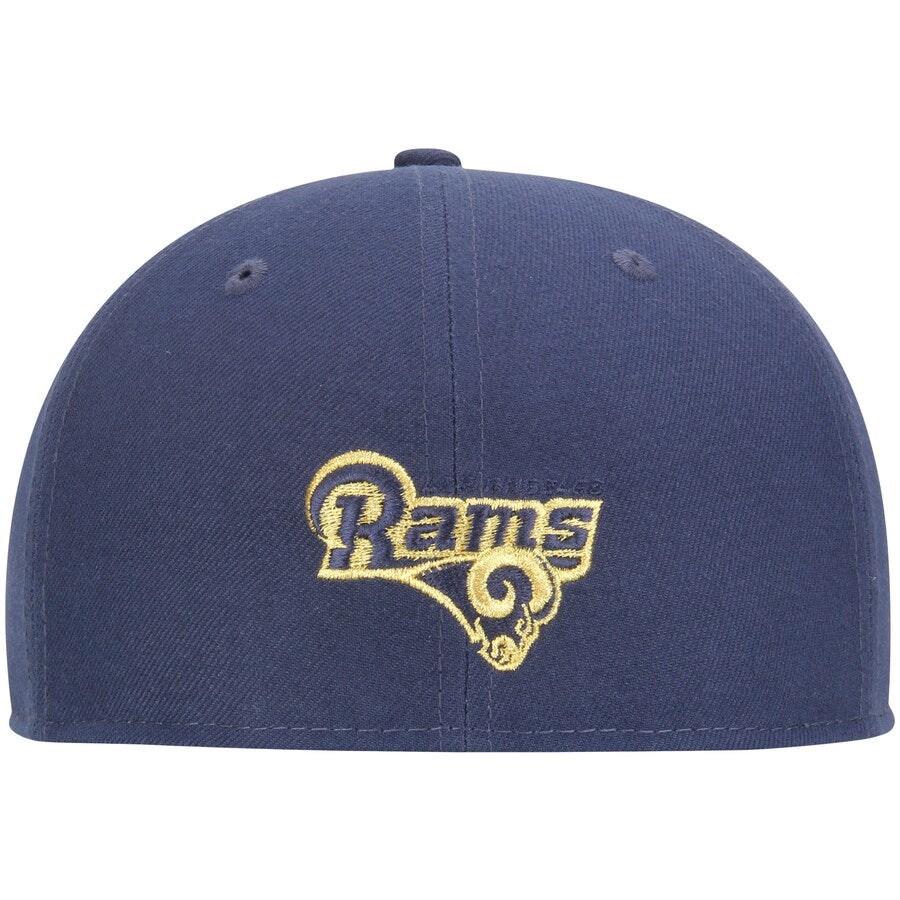 Los Angeles Rams New Era NFL 59FIFTY 5950 Fitted Cap Hat Navy Blue Crown/Visor Metallic Gold Text/Script Logo
