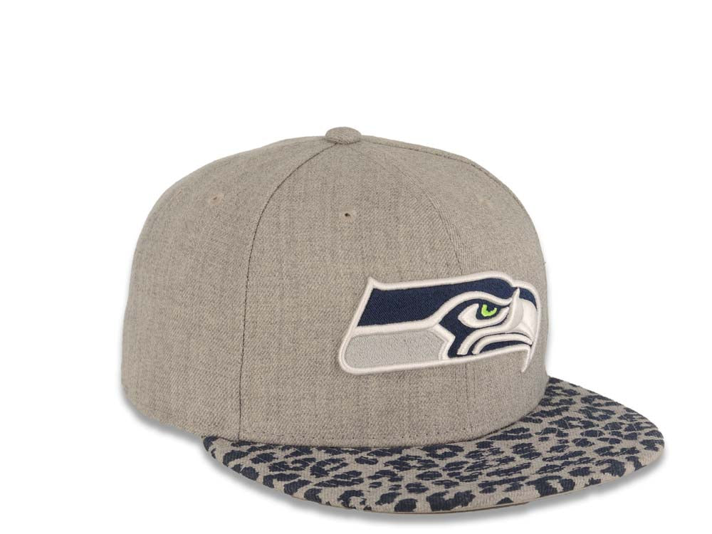 (Leopardvize) Seattle Seahawks New Era NFL 59FIFTY 5950 Fitted Cap Hat Heather Gray Crown Navy Blue/Gray Leopard Visor Team Color Logo
