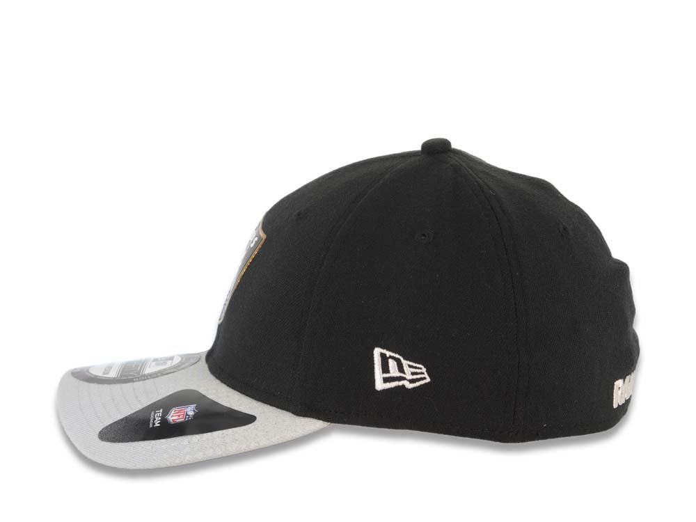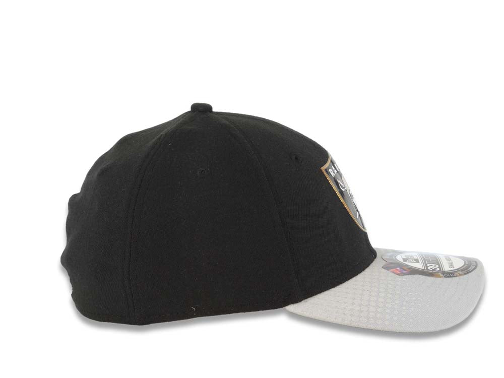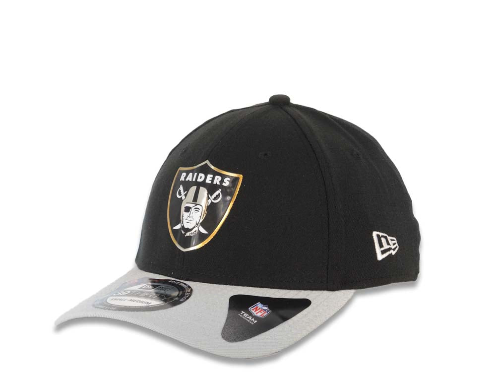 Oakland Raiders New Era NFL 39THIRTY 3930 Flexfit Cap Hat Black Crown Gray Visor Fused Metallic Applique Team Color Logo (2015 Draft)